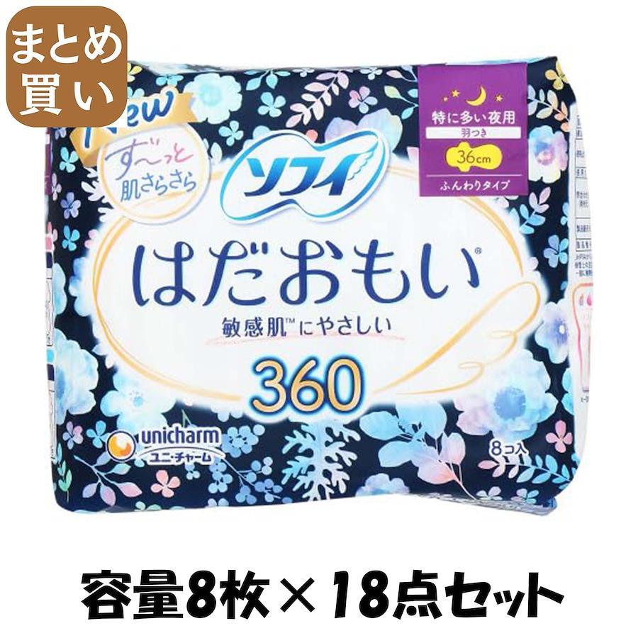 〇商品仕様ソフィはだおもい特に多い夜用360 8枚×18点セット単品サイズ470×255×310(mm) 容量8マイ(出典:ユニ・チャーム)