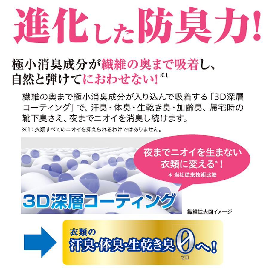 〇商品説明進化した消臭成分が繊維の奥まで入り込んで、しっかり吸着し、1日中ニオイに反応し汗のニオイ・体臭・加齢臭などを消臭します。乾きが早く、部屋干し抗菌成分配合で、部屋干し時の嫌なニオイを防ぎます。センイ1本1本まで柔らかく仕上げ、静電気を防ぎ、花粉の付着を防止します。※全ての菌に対して効果を有するわけではありません。