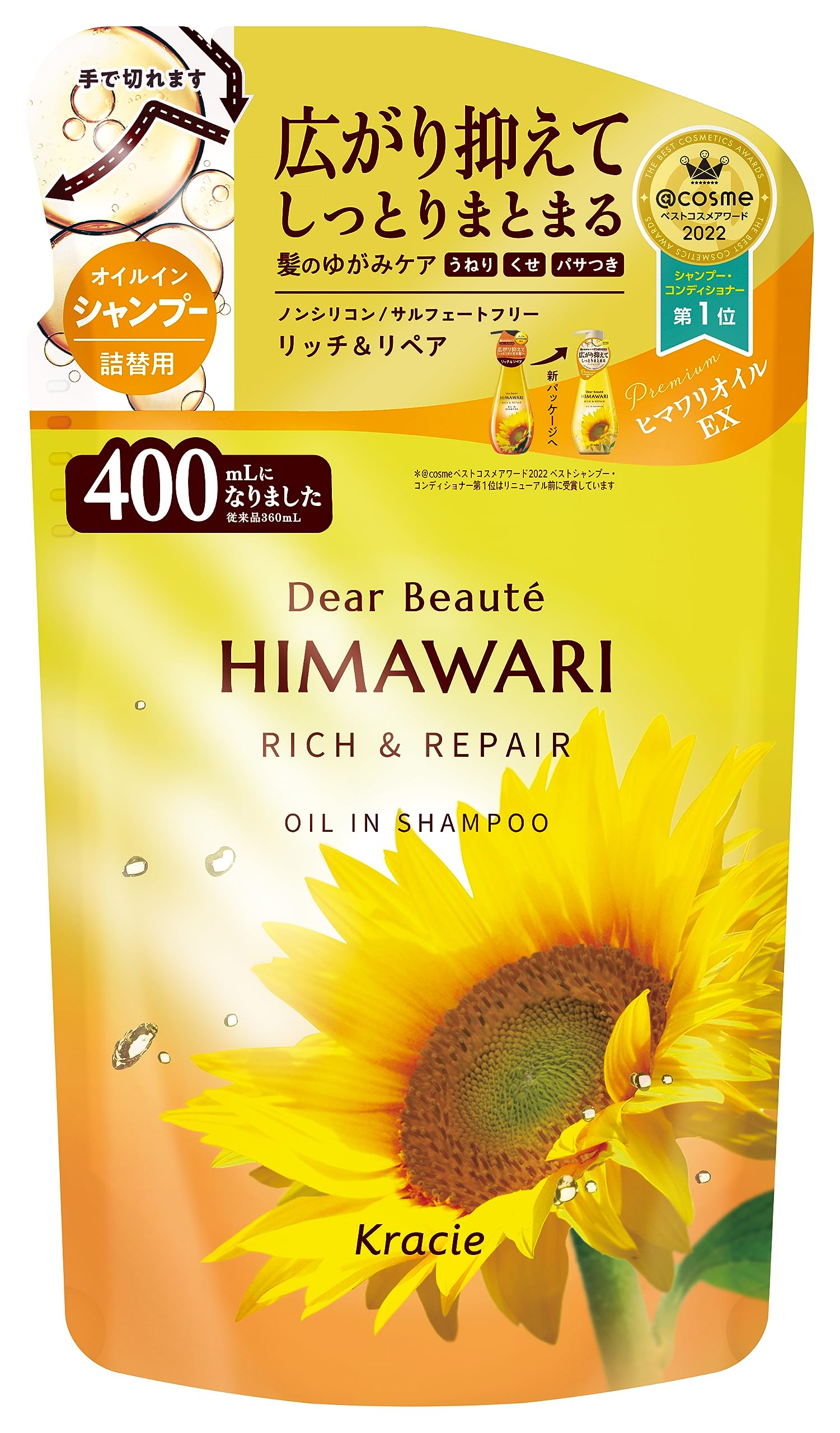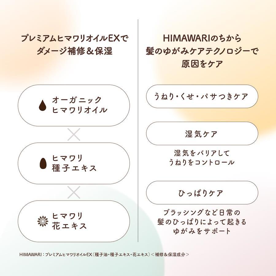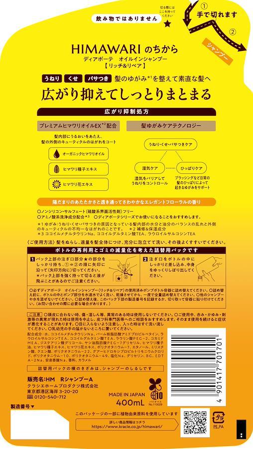 ??【開発の想い】明るく鮮やかな黄色い大輪の花を咲かせる“ひまわり”。「サンフラワー」「向日葵」「日輪草」と、呼び名はいずれも太陽に由来し、咲いているだけで人々を明るい気持ちにしてくれる。その「ひまわり」の力に着目。「以前と違って扱いにくくなってきた。」など髪質の変化に悩む女性に向けたシャンプーを届けたい。そんな想いで開発しました。ひまわりのように前向きに生きる美しきすべての女性へ。Dear Beaut? HIMAWARI??【髪のゆがみとは?】髪がパサつく、ハネ・うねりが出やすいなど、30代後半から感じ始める髪質の変化。こうした髪質の変化は、髪内部と外側それぞれの脂質と水分バランスの乱れ、いわゆる「髪のゆがみ」が原因に。ディアボーテHIMAWARIには、栄養豊富なひまわりの力をぎゅっと凝縮した「プレミアムヒマワリオイルEX」が配合されており、髪内部と外側の脂質と水分のバランスを整えます。??【リッチ&リペアシリーズの仕上がり】うねり・くせ・パサつきを整え、広がり抑えてしっとりまとまる髪へ。??【肌にやさしい処方設計】ノンシリコン処方&4種類のアミノ酸系洗浄成分※1を配合したシャンプー。シリーズ全品サルフェートフリー処方※2。 ※1 ココイルメチルタウリンNa、ココイルグルタミン酸TEA、ラウロイルサルコシンTEA、ココイルトレオニンNa、※2 硫酸系界面活性剤不使用??【陽だまりのあたたかさと透明感のある、心地良いエレガントフローラルの香り】トップノートは甘さのあるフルーティで始まり、ミドルノートのフローラルは奥深いエレガントさを増します。ナチュラル感を感じさせるシトラスグリーンにアンバーノートをアクセントに加えることで透明感のある輝きを表現しました。ウッディ、アンバーとムスクで女性らしいあたたかみのある残香に導きます。