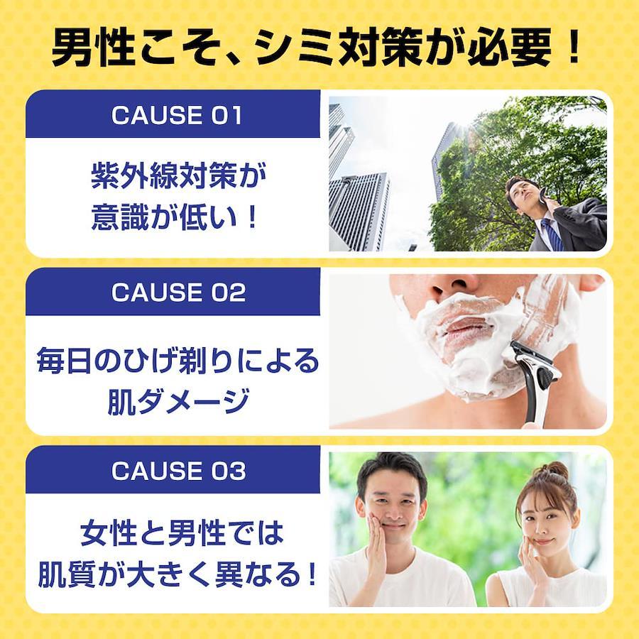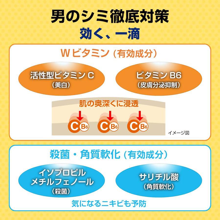〇商品説明男のシミ、徹底対策!肌の奥までWビタミン浸透!メンズシリーズが新登場!男性の肌特徴を考えた処方で気になるシミにしっかりアプローチ!