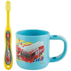 持ち手部が歯ブラシスタンドになっているコップと園児用歯ブラシのセット。