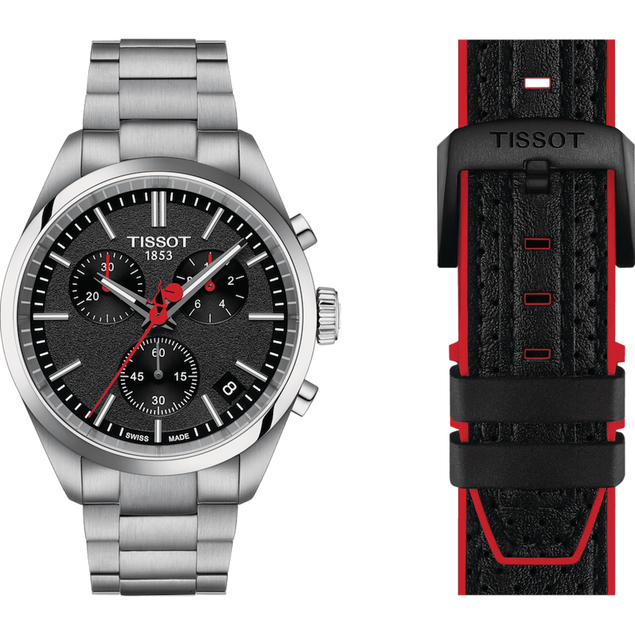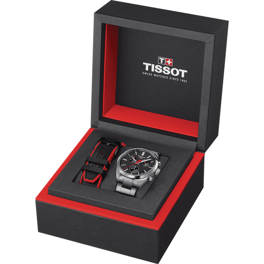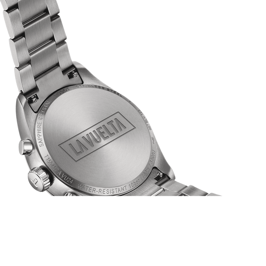 このスペシャル・エディションは、耐久性に優れた316Lステンレススチール製ケースを採用し、過酷な状況下でも時計の魅力を保つことを保証します。文字盤には、サイクリストの車輪の下にある道を映し出す、テーマカラーであるアスファルト・グレイン・ブラックを採用。自転車の形にデザインされたラ・ブエルタを象徴するレッドの秒針と、ブラック・ディスクの日付窓が時計にスマートなタッチを加えて調和しています。内蔵されたG10.212クロノ・クォーツ・ムーブメントは、10気圧(100m/330フィート)防水:を備え、精度と堅牢性を提供。また針にはスーパールミノバ?コーティングが施され、暗い場所での視認性も保証されています。グランドツアーPR100の裏蓋には、ラ・ブエルタのロゴを刻印。PR100の多機能性は、バタフライバックル付きの3列メタルブレスレットによってさらに高められています。付属のブラックのストラップは自転車のハンドルグリップの素材を使用し、ラ・ブエルタカラーが特徴です。