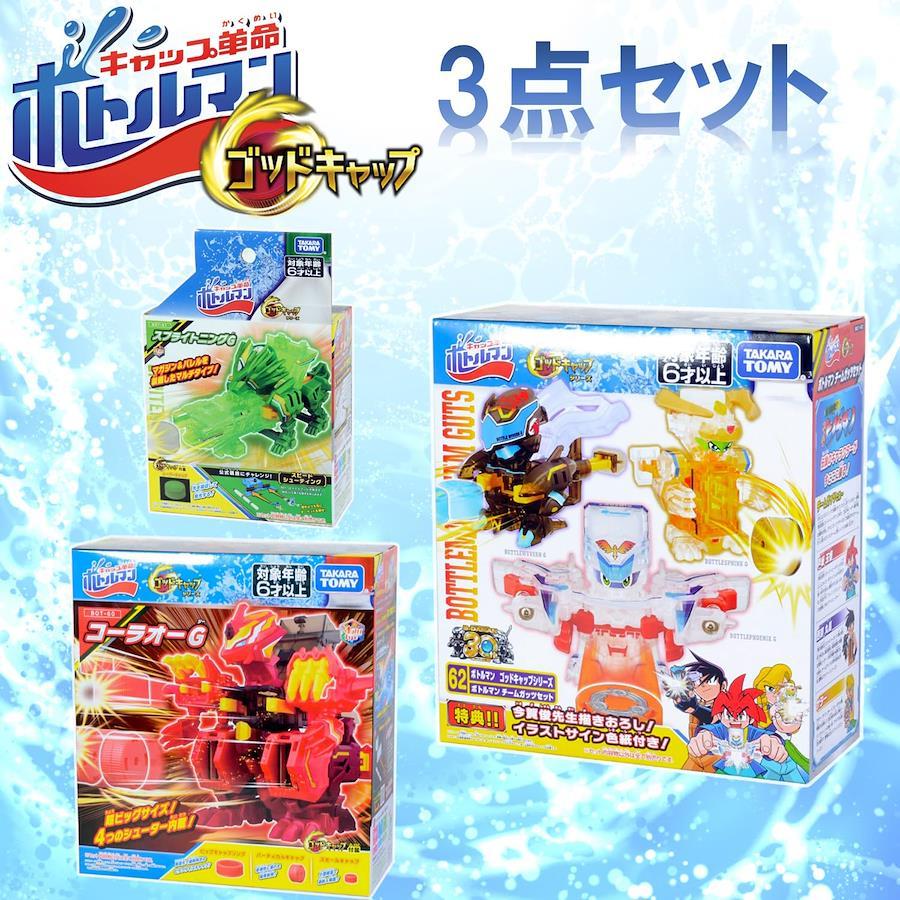【対象年齢】6歳から【セット内容】(計3点セット)・BOT-60 コーラオーG (JAN:4904810916000)・BOT-61 スプライトニングG (JAN:4904810916017)・BOT-62 チームガッツセット (JAN:4904810916024)【商品紹介】[ボトルマン] ボトルマンとは、 ペットボトルキャップを発射して様々な競技を楽しめるシューティングホビーだ! ボトルキャップ爽快発射で遊び方無限大!![カスタマイズ] ボトルマンは様々な組み合わせでカスタマイズが可能! 自分だけのオリジナルカスタマイズで最強のボトルマンを作ろう![ゴッドキャップシリーズ] ゴッドキャップシリーズとは、 通常のキャップとは異なる能力を持ったGキャップを発射すること特化したシリーズ。 競技に合わせてGキャップを使い分けよう! 旧シリーズのDXシリーズともカスタマイズ組み合わせ可能だぞ!【免責事項】メーカーによる商品リニューアルに伴いパッケージ(内容量も含む)変更が行われた場合、新パッケージでお届け致します事ご了承願います。