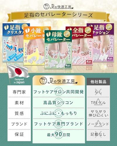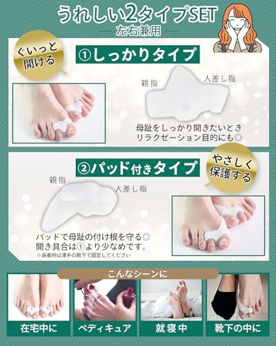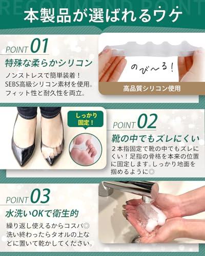 [足指セパレーター/足指 広げる/足の指を広げるグッズ/足指をまもる/足指サポーター/足指ストレッチ/フットケア/寝指/浮き指/巻き爪/足の指広げるグッズ/足の指 広げる/足指開き/外反母趾矯正グッズ/外反母趾 サポーター/内反小趾/ないはんしょうし 矯正 小指 サポーター/寝指 矯正/ 足指マッサージ/ペディキュア] ?【フットケアサロン共同開発】年間1000人以上の足を見るプロの意見を取り入れ、現場目線から開発しました。足指を開く, 外反母趾(がいはんぼし), 内反小趾(ないはんしょうし), 巻き爪, 浮き指, 寝指 などのサポーターとしてご活用いただけます。 ?【高品質シリコン素材】ぷにぷにと柔らかい感触で足指を優しくサポートします。高い伸縮性によりフィット感と、長時間装着しても痛くなりにくい、快適な使用感を実現しました。<br/>?【2タイプSET】シーンに合わせて使い分け!①しっかりタイプ:母趾をしっかり開きたいとき、リラクゼーション目的にも◎ ②パッド付きタイプ:パッドで母趾の付け根を守る◎開き具合は①より少なめです。 ?【人間工学に基づいた設計】日本人の骨格を分析し、アーチ型をサポートするデザインになっています。適度な丸みと幅により足指の独立性を高め、しっかり地面を掴めるようにサポートします。<br/>?【最適な足指の間隔】足指への負担を分散する設計が、足全体のバランスを整え、健康的な足の形を維持するのに役立ちます。装着しながらエクササイズすることで正しい姿勢へ導きます。 ?【様々なシーンで使用可能】歩行時、運動時(ランニング、ヨガなど)、在宅時、就寝時など、様々なシーンで活躍します。<br/>?【コスパ◎清潔感◎】耐久性があり水洗いすることで、清潔な状態で繰り返しご使用いただけます。タオルの上で自然乾燥させてください。 ?【プロ監修の説明書付き】「2種類の足指セパレーターの使用方法」「日本人の骨格と足のトラブル」「足指ストレッチ」外反母趾・内反小趾にお悩みの方はぜひご自身の足指の状態を確かめ、適切なケアにご活用ください。 [足指セパレーター/足指 広げる/足の指を広げるグッズ/足指をまもる/足指サポーター/足指ストレッチ/フットケア/寝指/浮き指/巻き爪/足の指広げるグッズ/足の指 広げる/足指開き/外反母趾矯正グッズ/外反母趾 サポーター/内反小趾/ないはんしょうし 矯正 小指 サポーター/寝指 矯正/ 足指マッサージ/ペディキュア]