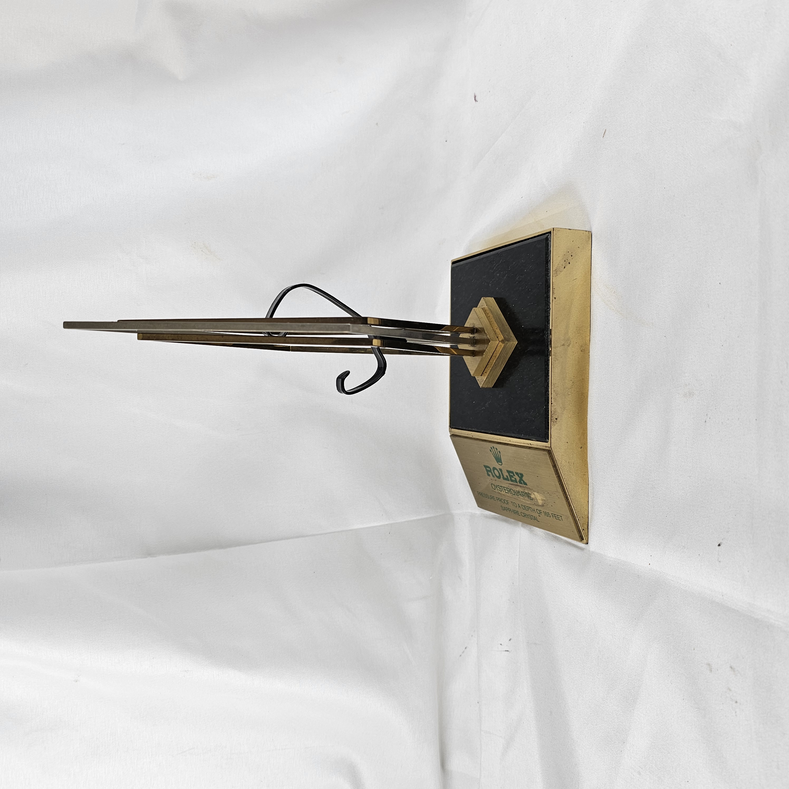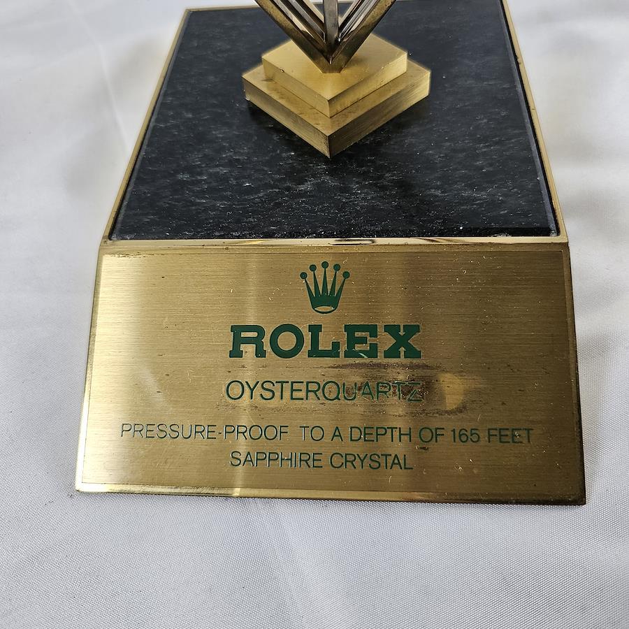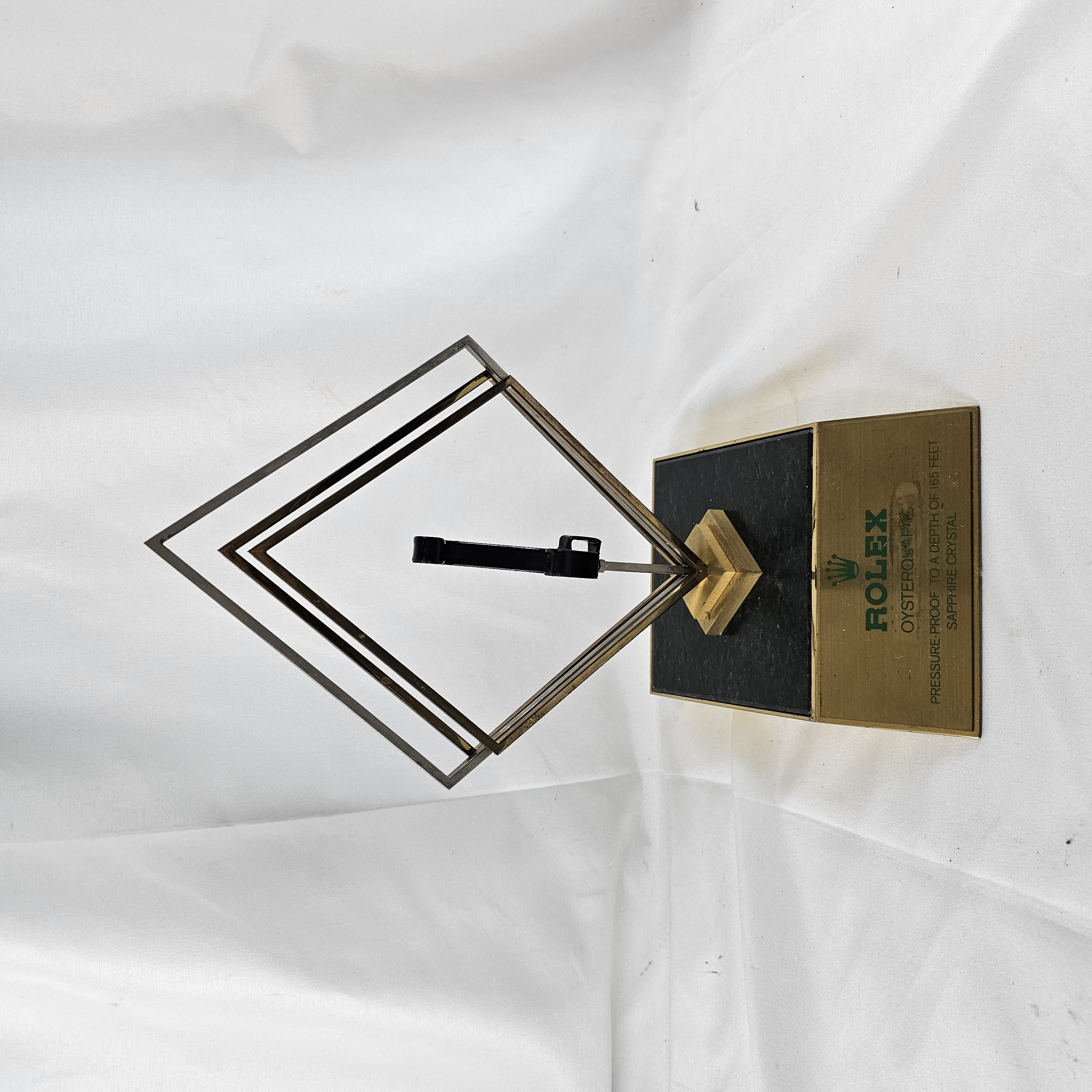 ◆商品紹介**ROLEX(ロレックス)のヴィンテージ・ディスプレイスタンド(非売品)です。 かつてロレックス正規販売店で、伝説的な「オイスタークォーツ」**モデルを展示するために制作された、大変希少価値の高い販促用ディスプレイ什器です。 ゴールドトーンの真鍮とブラックの台座、そして斬新なダイヤモンド型のフレームが、時計本体の魅力を引き立てます。