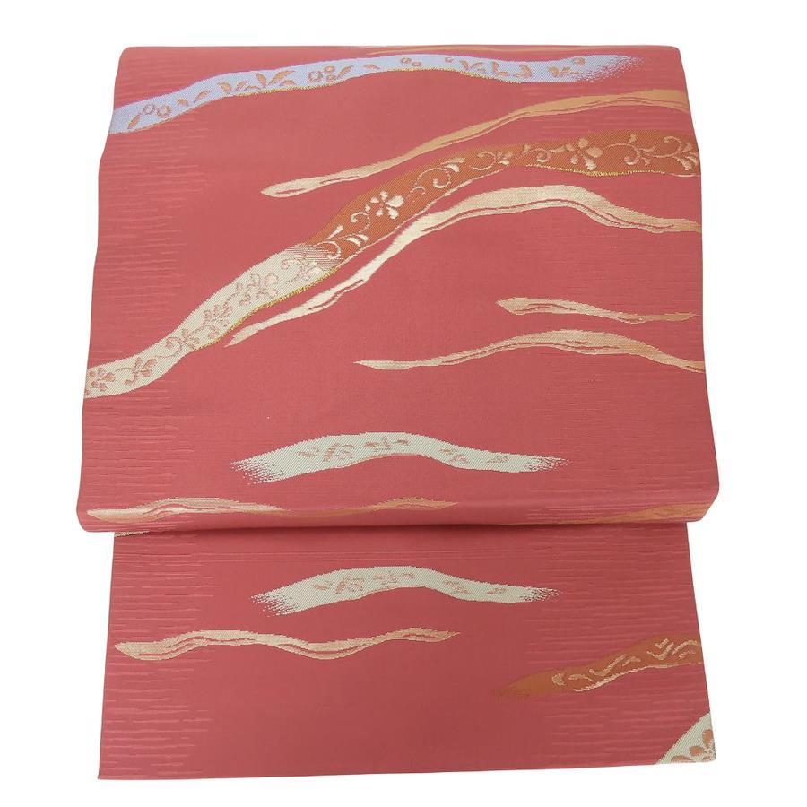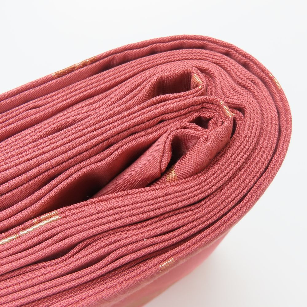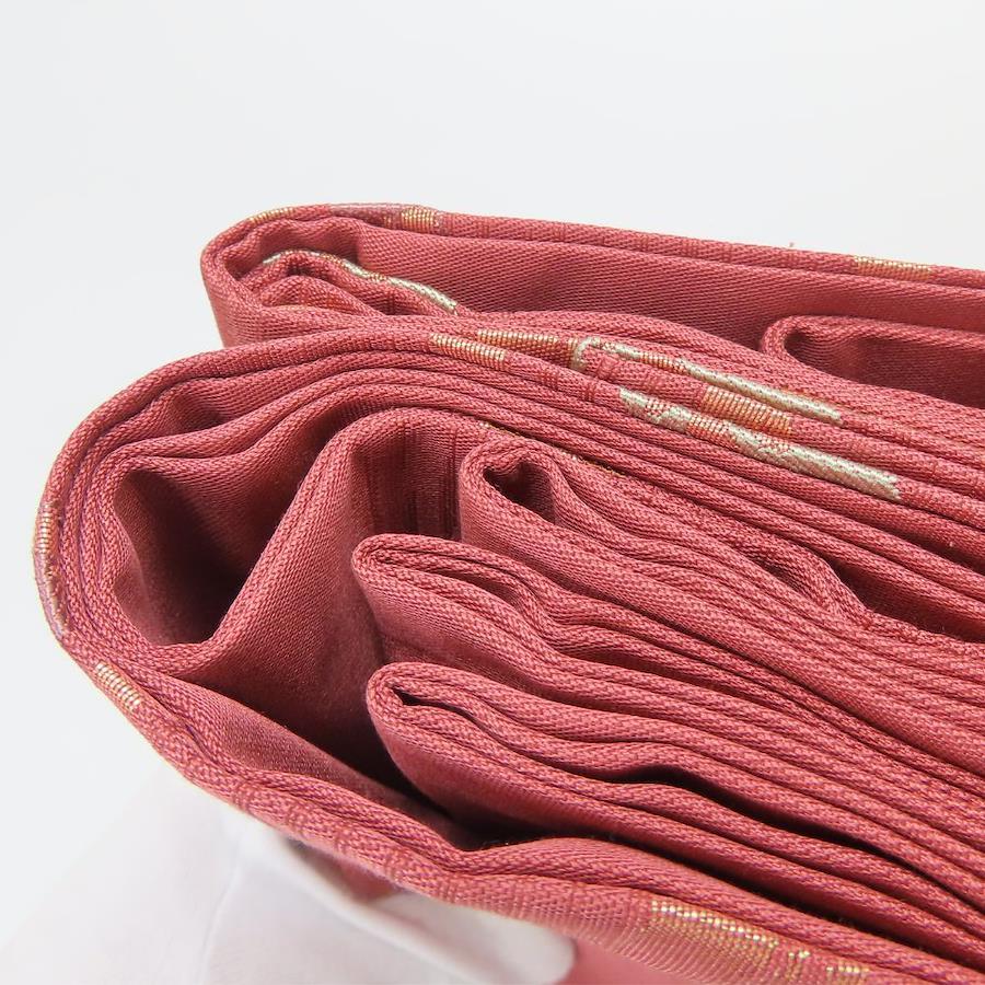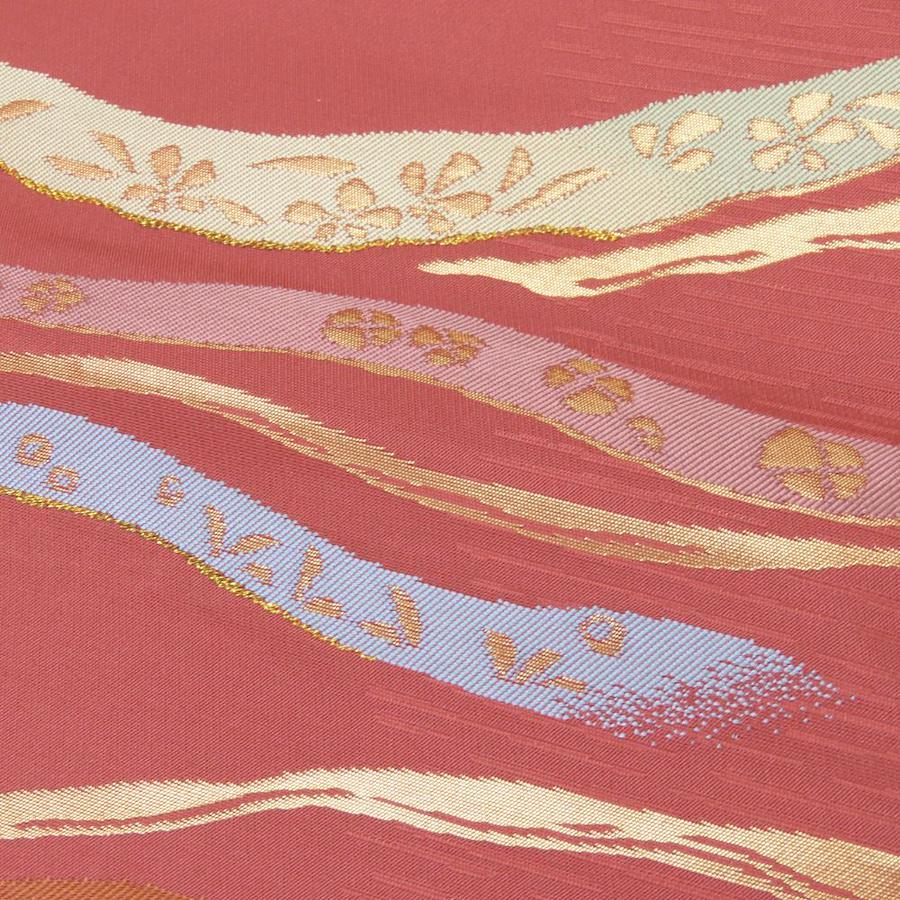 品名【中古】 名古屋帯 九寸 正絹(金銀糸除く) えんじ系 ピンク系 ゴールド マルチカラー 名古屋仕立て 六通柄 モダン レディース 女性
