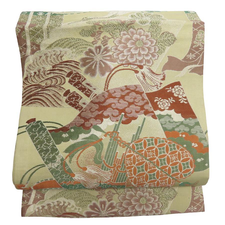 | 品名 | 【中古】 名古屋帯 京袋 全通柄 正絹(金銀糸除く) ベージュ系 マルチカラー 丸帯 アンティーク 吉祥文様尽くし レディース 女性 |