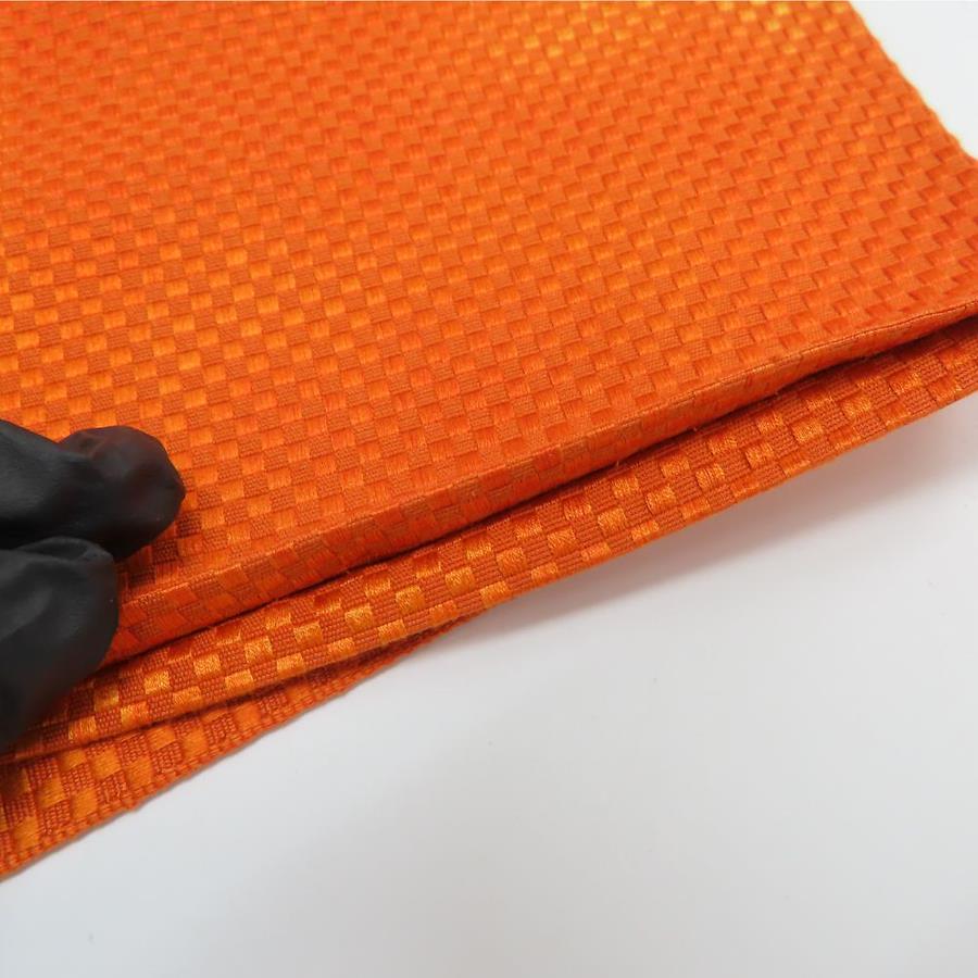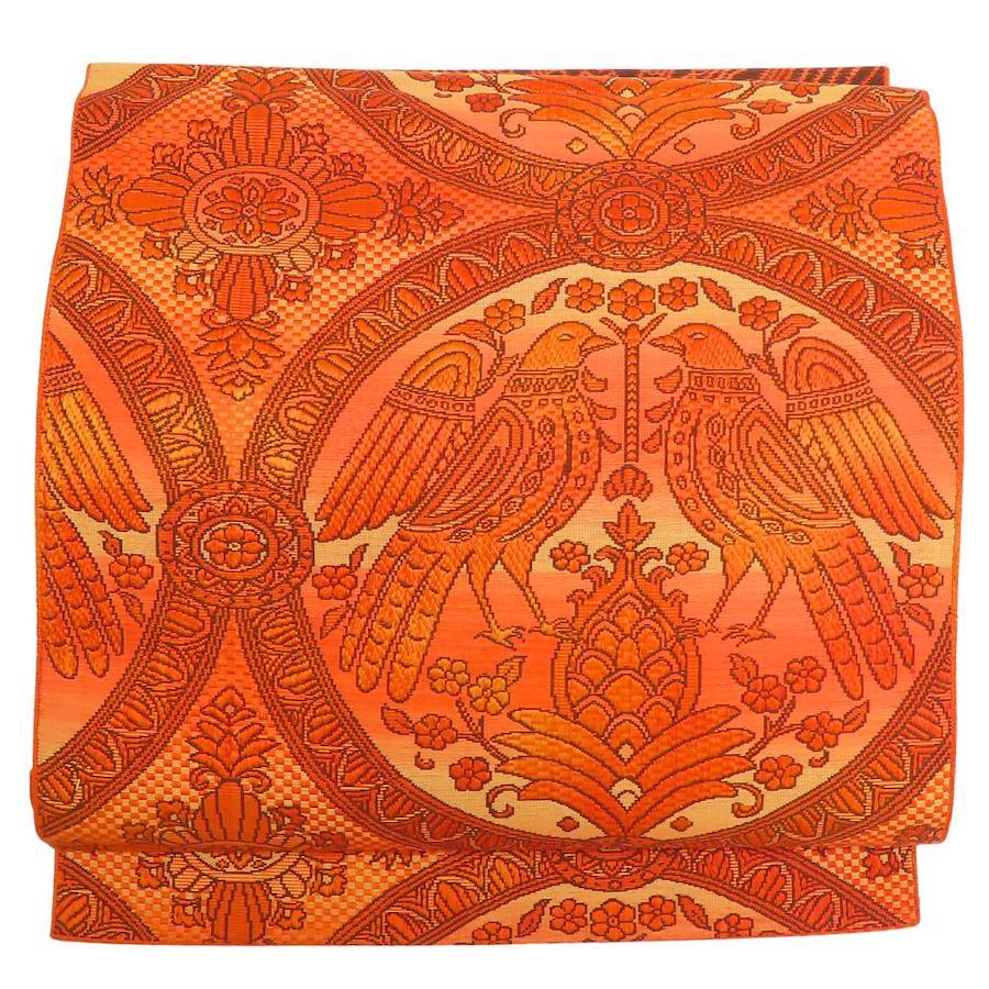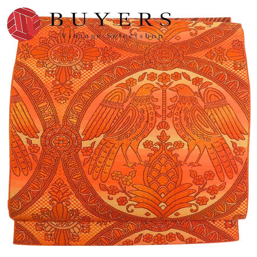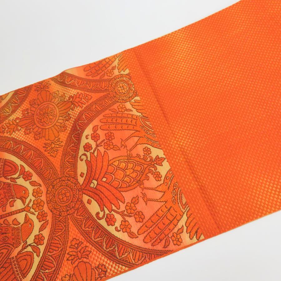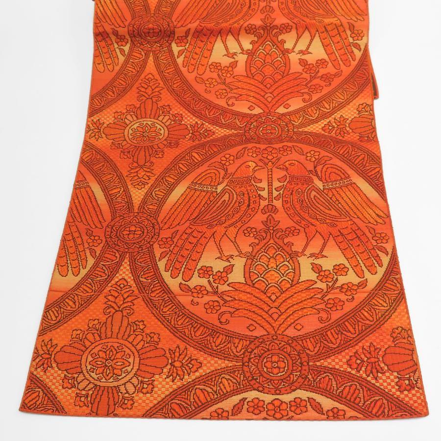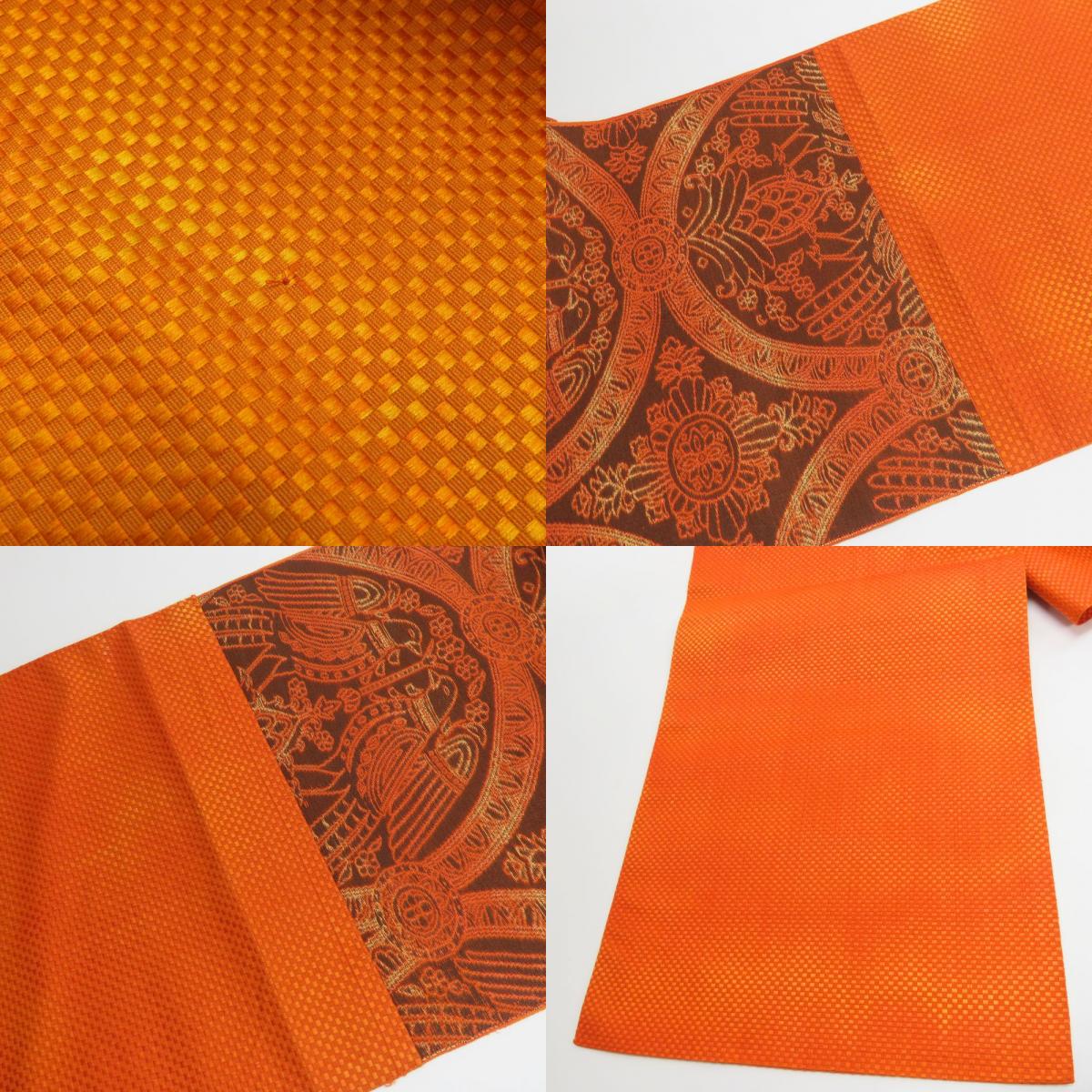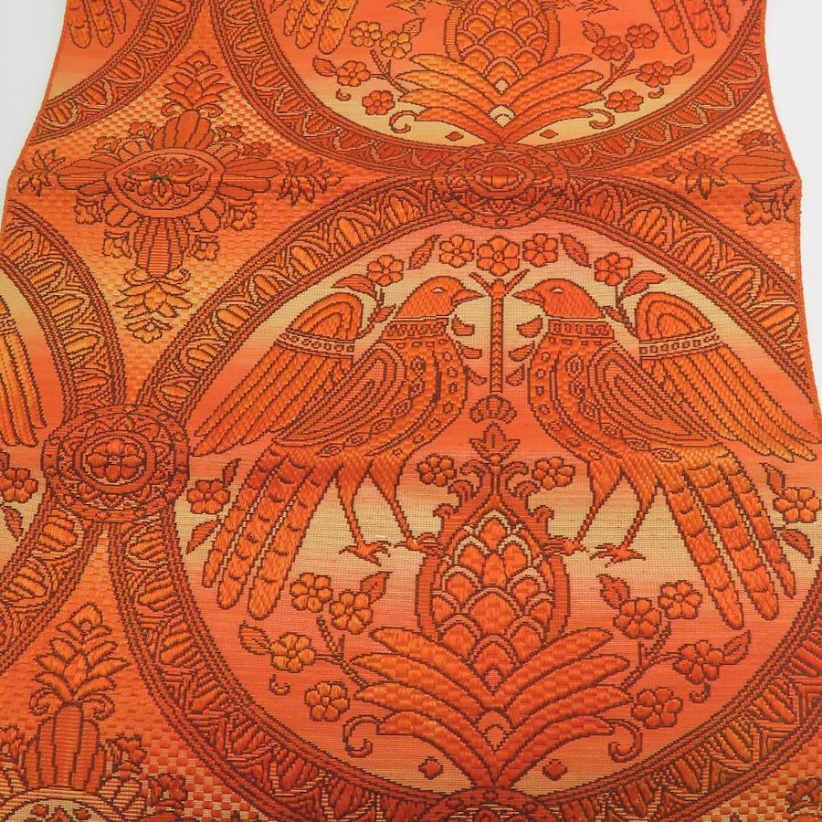 | 品名 | 【中古】 名古屋帯 八寸 正絹(金銀糸除く) オレンジ ブラウン 松葉仕立て 六通柄 二羽の鳥模様織り出し レディース 女性 |