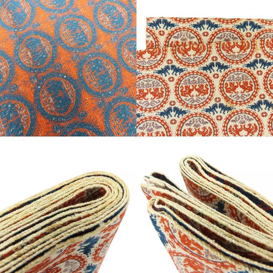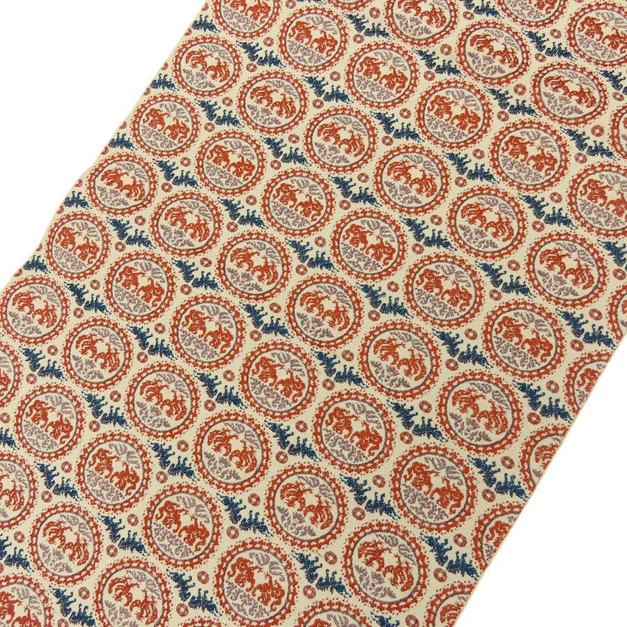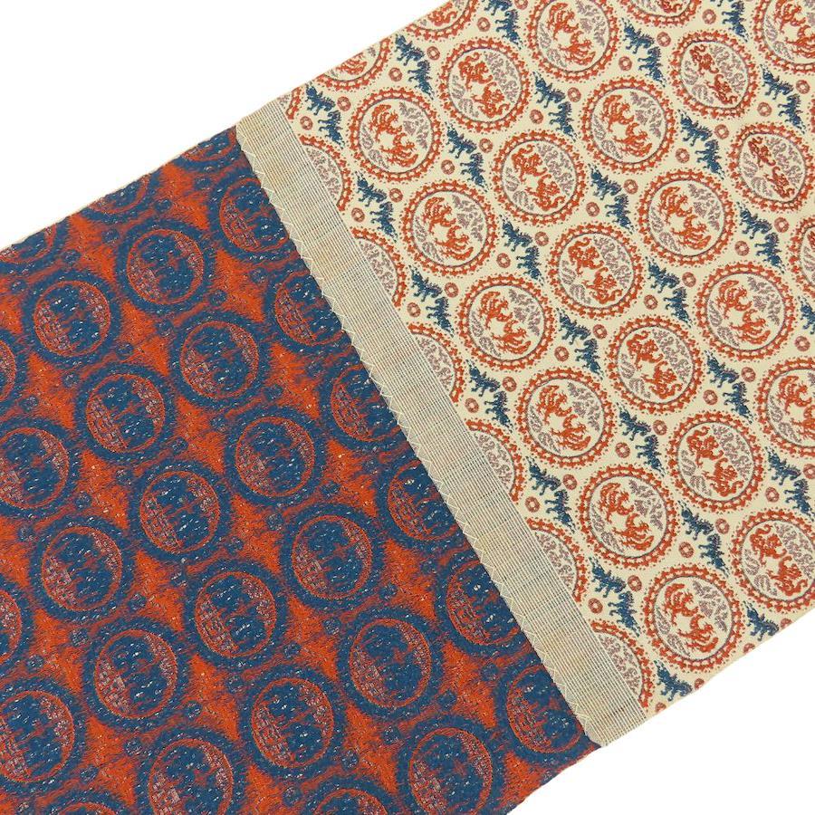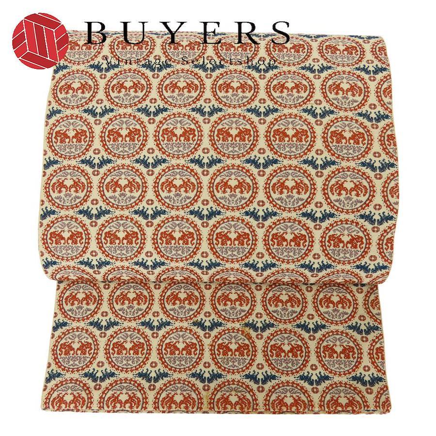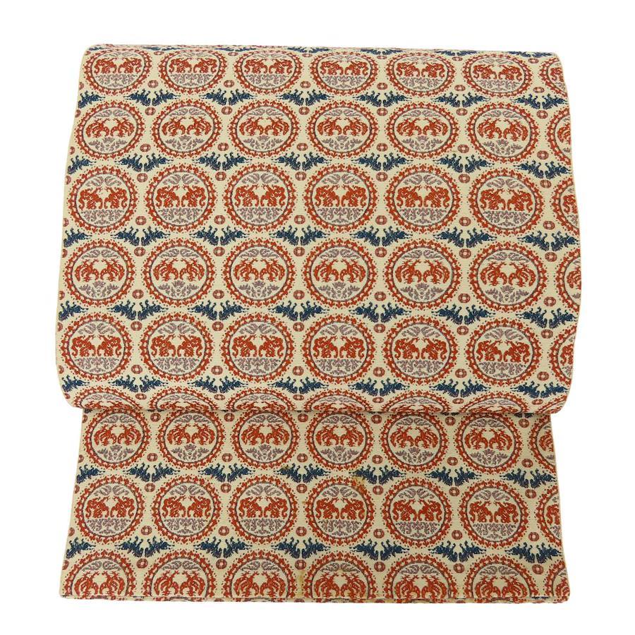 | 品名 | 【中古】 名古屋帯 八寸 正絹(金銀糸除く) ベージュ オレンジ系 ネイビー系 正倉院文様 モダン レディース 女性 |