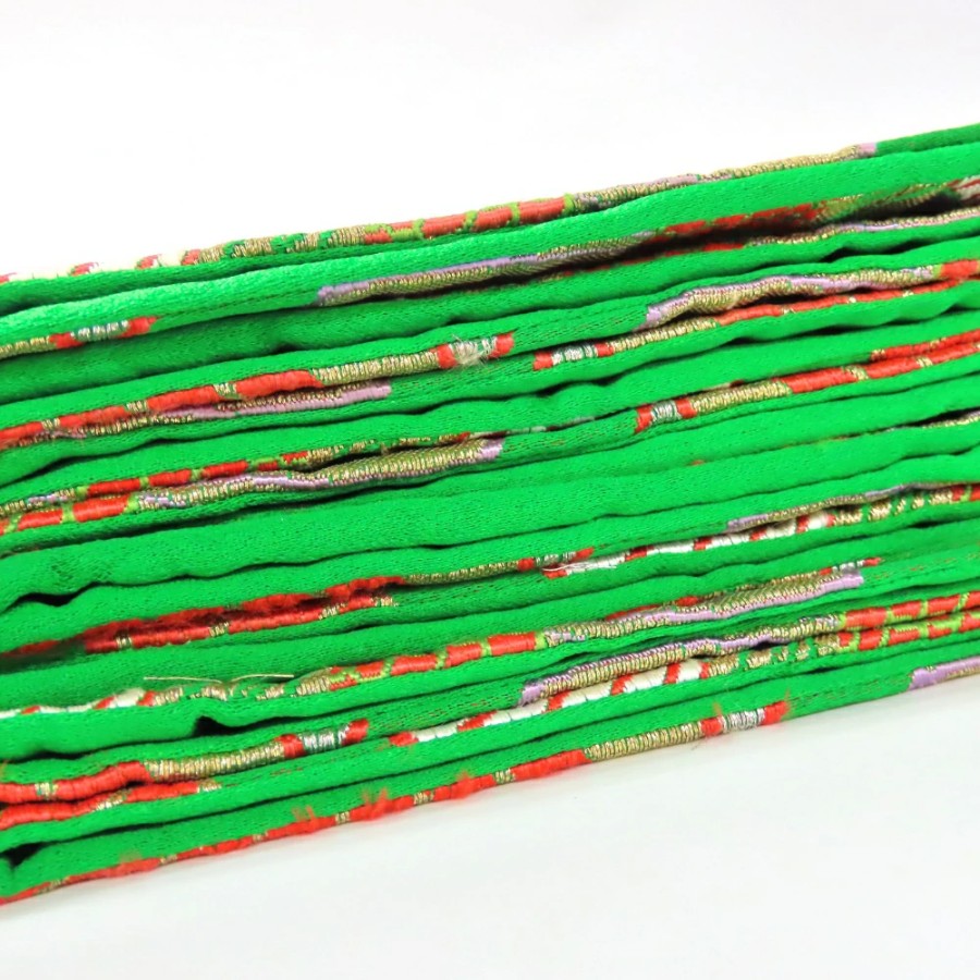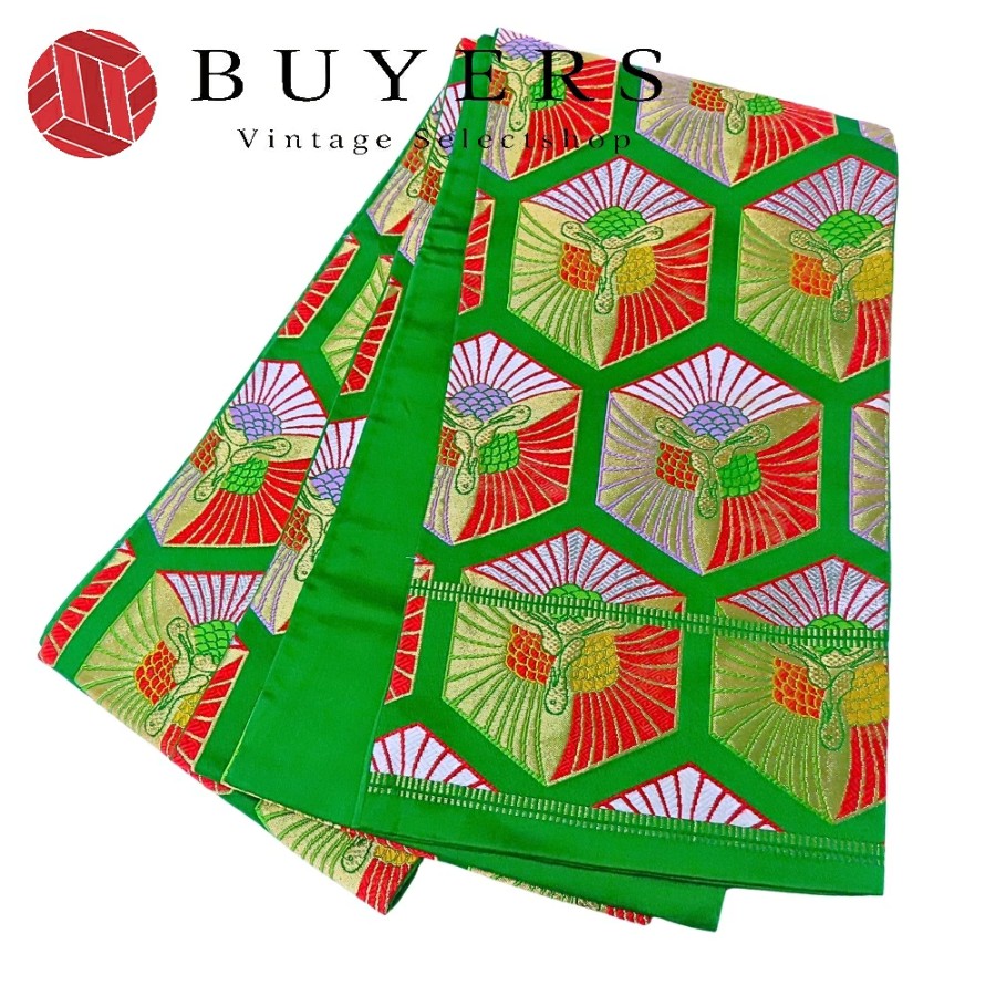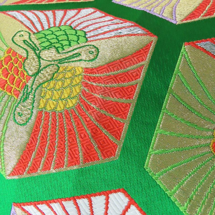 | 品名 | 【中古】 袋帯 七五三用 化学繊維 グリーン ゴールド マルチカラー 女の子 亀甲 |