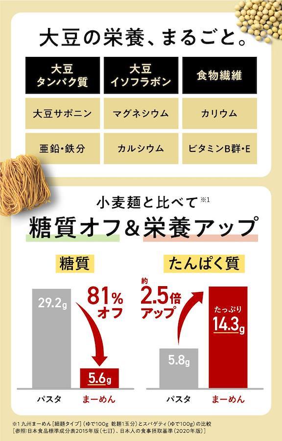 1食あたり 糖質:5.6g 食物繊維:6.0g タンパク質:14.3g 脂質:3g。【パスタよりヘルシー!】ゆでパスタ100gと比較すると、たんぱく質約2.5倍!食物繊維2倍!カロリー約21%OFF!糖質約81%OFF!(まーめん茹で100gと比較)高たんぱく、低糖質、低脂質、食物繊維豊富、グルテンフリー。【アイドルや芸能人も愛用】雑誌MAQUIA「田中みな実を作る食事」、「指原莉乃の100推しビューティーBOOK」で紹介されています??早ゆで〈3分〉!【電子レンジ調理もOK!】耐熱容器にまーめんと、まーめんが浸かるくらい水を入れたら温めるだけ。<500W→8分>大豆は九州産の「ふくゆたか」もしくは「ふくよかまる」の2種いずれかを使用。パスタはもちろん、そばや冷やし中華、冷麺など様々な麺料理にアレンジ自在。【賞味期限】製造日より約2年【重要】メーカーによる商品リニューアルに伴いパッケージ(内容量も含む)変更が行われた場合、新パッケージでお届け致します事ご了承願います。