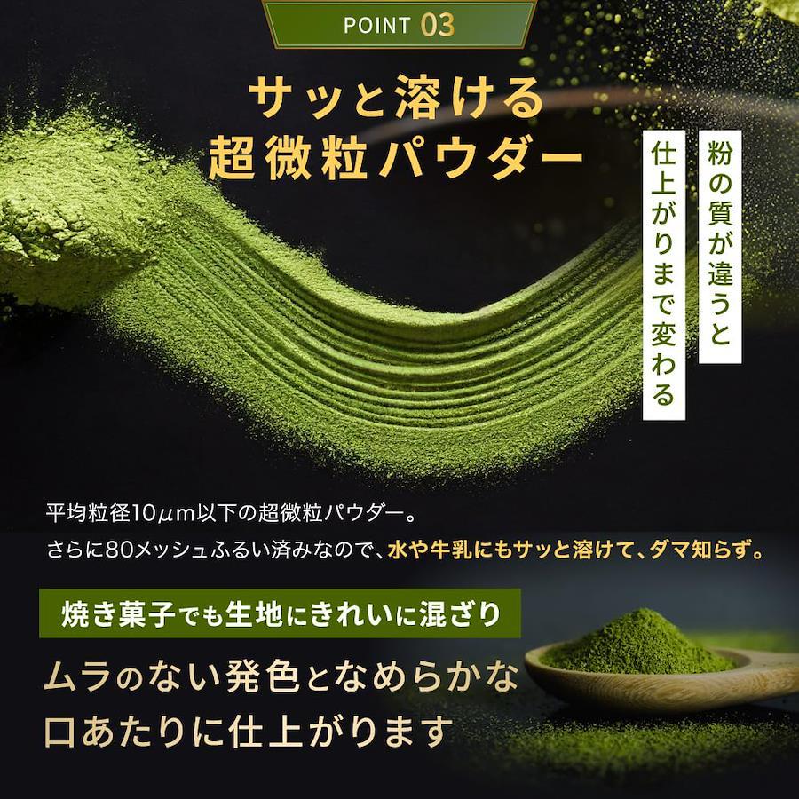 【宇治抹茶100%使用】 京都・宇治産の抹茶のみを贅沢に使用した純粋な抹茶パウダーです。?【焼いても色・香りが持続】 パンやお菓子作りでも鮮やかな緑色と香りがしっかり残ります。?【サッと溶ける超微粒パウダー】 ドリンクやスイーツに混ぜやすく、ダマになりにくい微粒子タイプです。?【国内製造 × GMP認証 × 無添加】 国内GMP認証工場で生産し、香料・着色料・保存料など無添加の安心品質。?【幅広いアレンジに使える】 お茶はもちろん、ラテやパン、グラノーラ、ヨーグルト、焼き菓子など様々なレシピにおすすめです。【免責事項】メーカーによる商品リニューアルに伴いパッケージ(内容量も含む)変更が行われた場合、新パッケージでお届け致します事ご了承願います。