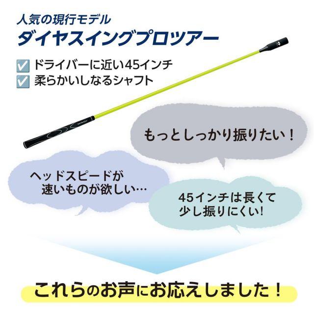 理想のスイングを覚えられるダイヤのスイング練習器シリーズに新製品『ダイヤスイングプロツアーTB』が登場!女子プロにも好評な長尺練習器具『ダイヤスイングプロツアー』のNEWモデル!・2インチ短くした43インチでより振りやすい長さに!・カチッ!と音が鳴るヘッドスピードを20m/sから30m/sに調整、かつバランスD0仕様で振りごたえのある仕様に!ラウンド前のウォーミングアップからパワーアップまで、ドライバーに近い感覚で練習することができる一本です!