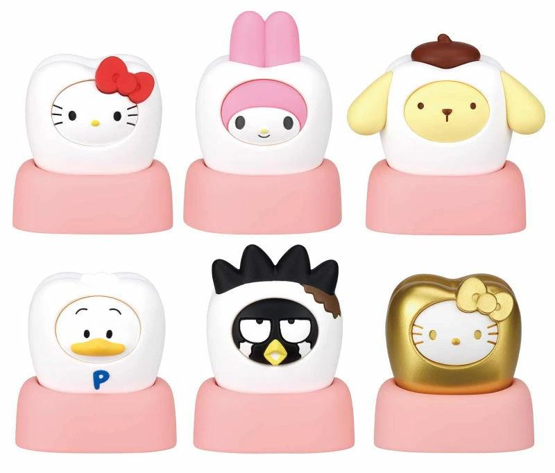 サンリオキャラクターズたちが、「歯」のかぶりものをかぶったユニークなマスコット。歯茎型の台座は、並べると下顎のように半円系で飾ることができます。ゴールドカラーの「ハローキティ」はレアアイテムです。