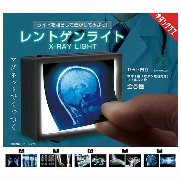 病院で一度は見たことある、レントゲン写真を見るときのライト「シャウカステン」が、なんとミニチュアになってカプセルトイで登場します!発光ギミックを搭載した本体のライトをつけて、付属の『ミニレントゲンフィルム』をかざせば、気分はまるで医療のプロフェッショナル。さらに、本体裏面にはマグネットが内蔵されているので、冷蔵庫やロッカーなどに貼り付けて楽しめます♪電池交換が可能なので長く遊べるのも嬉しいポイント。光って飾って遊べて楽しい!※ボタン電池LR41×2個使用(テスト電池つき)