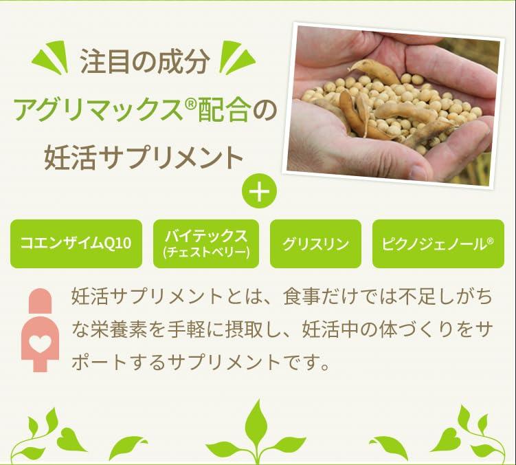 ■サイズ:??19.7x11.7x1.8cm;50g 遺伝子組み換えでない大豆から胚芽だけを使い、特許製法(日本特許3014145号)の黒麹菌発酵技術で有効性を高めた”アグリコン型イソフラボン”の「AglyMax」配合。 妊活をサポートする成分の「ピクノジェノール」「グリスリン」「バイテックス」「コエンザイムQ10」も配合。 妊活サプリメントとは妊活に必要な栄養素を摂取することが目的のサプリメントです。食事だけでは不足しがちな栄養素を手軽に摂取し、妊活中の体づくりをサポートします。 ■重要なお知らせ安全上のお知らせ妊娠発覚後および授乳中の摂取は控えて頂くことをおすすめします(※特に深刻な症状が出ることはありません)。また厚生労働省の指針では、妊娠中および授乳中におけるイソフラボンサプリメントの摂取を推奨しないと伝えております原材料・成分マルチトール、還元パラチノース、マカ粉末、麹菌発酵大豆胚芽抽出物(大豆を含む)、グリスリン含有マイタケエキス、フランス海岸松樹皮抽出物、バイテックスエキス、コエンザエムQ10、/結晶セルロース、イノシトール、ヘム鉄(豚由来)、HPC、ステアリン酸Ca、ラクトフェリン(乳由来)、ビタミンD