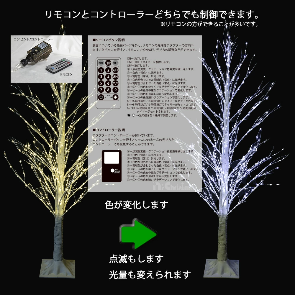 ホワイトバーチツリーの特長として、リモコンとコンセントに付属されたスイッチで9種類の光り方の変化が楽しめるほか、リモコンで点灯時間タイマーのセットと光量を変える事もできます。