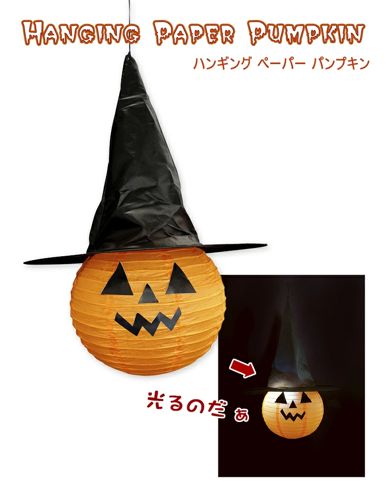 ハンギングペーパーパンプキン☆天井スペースを飾れる!簡単組み立て式のペーパーランタンは、天井や窓から吊るして飾ればアイキャッチや目印としてピッタリ☆かなり大きいのに激安!たくさん飾ればすごいインパクト!キャンプでテントの中に飾るのも楽しいかもしれませんね。スイッチを入れると中のLEDが光ります。パンプキンの顔は、付属のシールを自由に貼って完成させてください。(室内仕様・常灯)