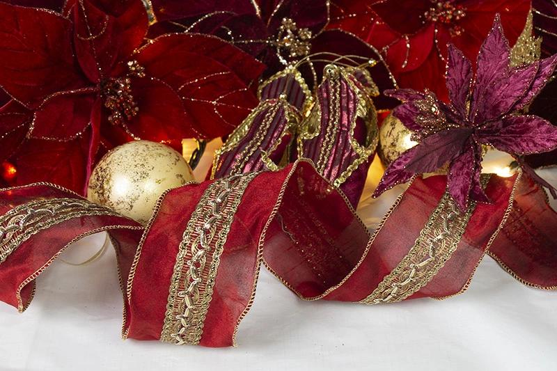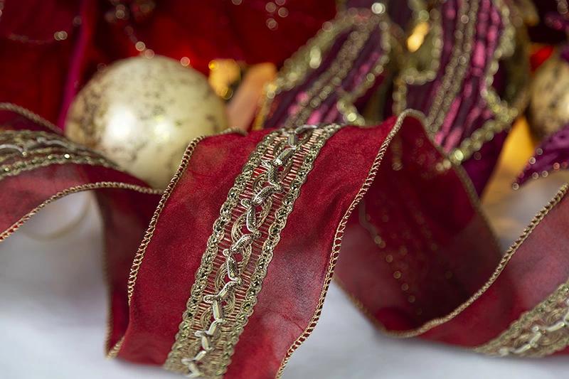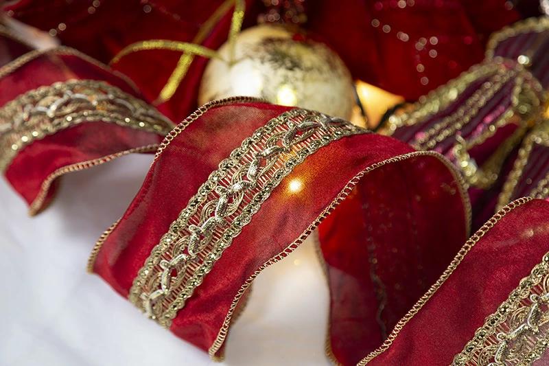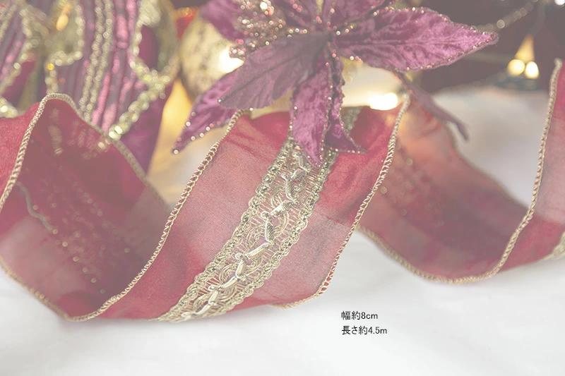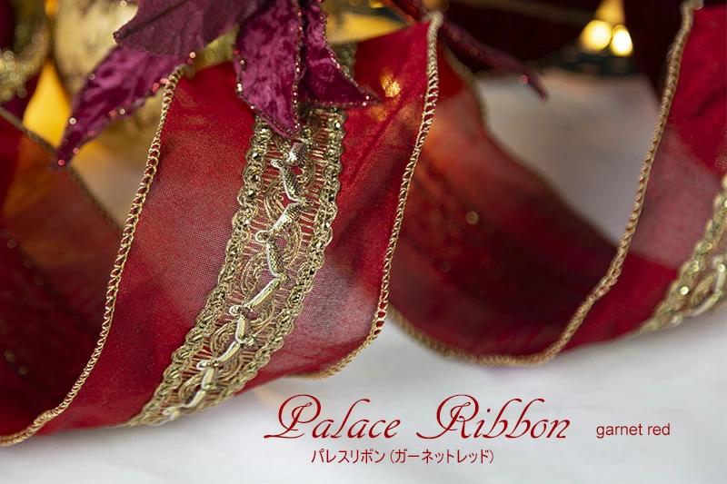 パレスリボン(ガーネットレッド)☆美しい大人リボンパレスリボンは大人っぽいオーナメントに合わせやすいリボンです。幅は8cmで中央にはスパンゴールの付いた金糸を施した大変ゴージャスな仕様となっています。もちろん縁にはワイヤーが入っているので思い通りの形にできます。※巻の最初が分かるように”まち針”が付いていますので、お気を付けください。