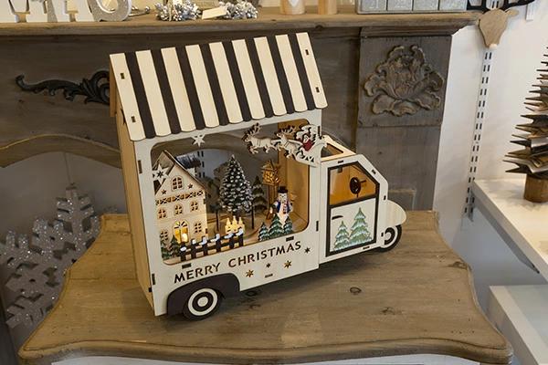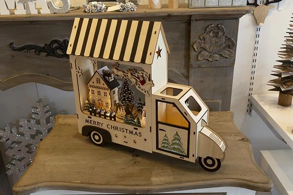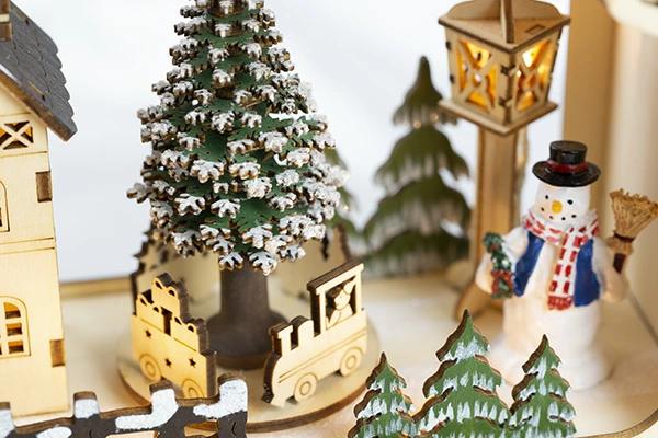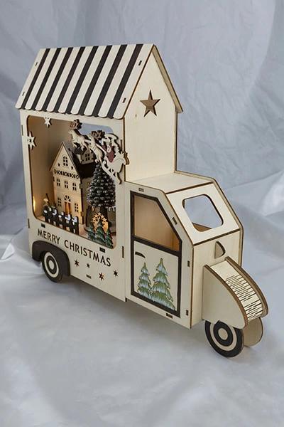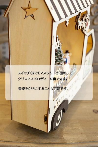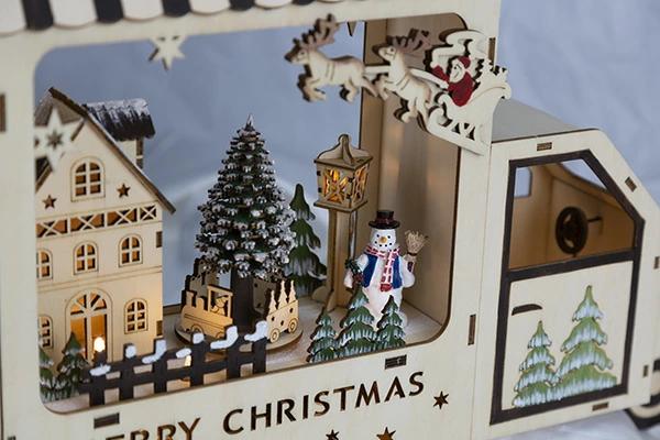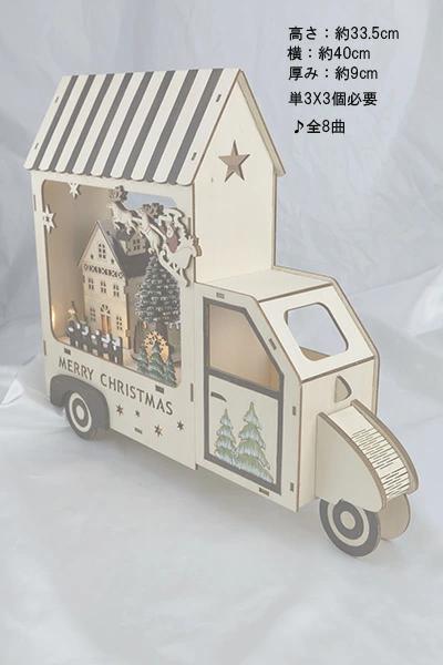 荷台にクリスマスツリーやスノーマン、そして灯りがついたおうちが並んでいてとても可愛いです。スイッチONで点灯しクリスマスソングを奏でます。(8曲)メロディーOFFもできますよ。