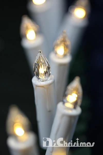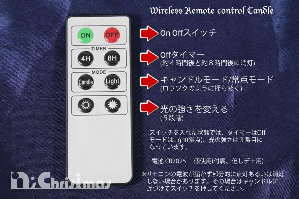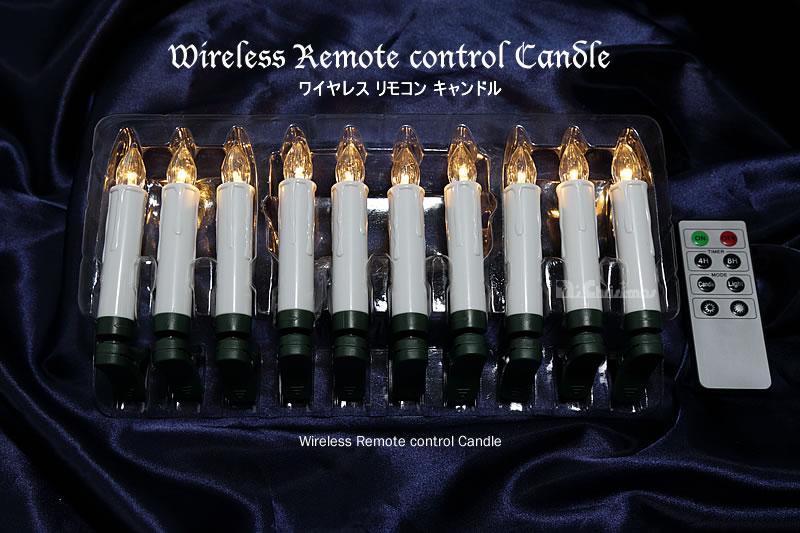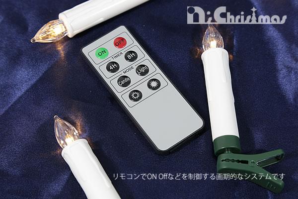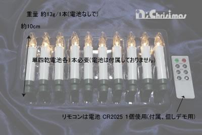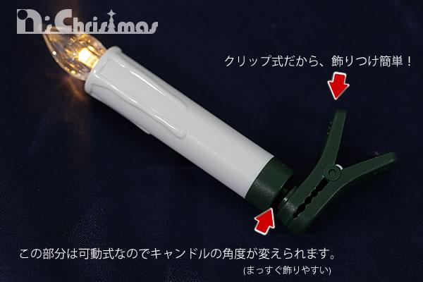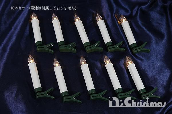 ※電池を入れたときに点灯します。(消す場合はOFFボタンを押してください。)※キャンドルの設置場所によってはリモコンの電波が届かず、点灯、消灯しない場合もあります。その場合はそのキャンドルの近くで再度ONボタン、OFFボタンを押せば点灯、消灯します。・キャンドル高さ:約10cm・キャンドル数:10本/1セット・キャンドル重量:約13g/本(電池含まず)・クリップ式(好きな場所にクリップで留めることができます。)・本体とクリップの接合部は可動します。(キャンドルの角度可変)・2種類のOFFタイマー(約4時間後と8時間後に消灯)・常点・キャンドルモード(キャンドルボタンで光がゆらめきます。)・光の強さ可変:5段階(スイッチONで最初は真ん中の強さとなります。)・各キャンドル単四電池1本使用(電池は付属していません)※電池合計10本必要・ワイヤレスリモコン付(デモ用ボタン電池付属CR2025)・室内仕様