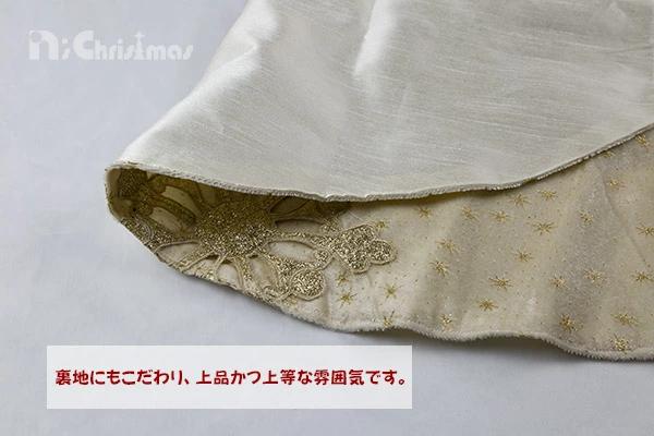 光沢があるベロア調の生地にゴールドの雪模様をあしらったツリースカートです。ホワイト、ゴールド、そして優しい風合いなのでファンシーなオーナメントなどにも幅広く合わせることができます。ふわっとした生地にキラキラ輝く雪のパッチワークを施し、あらゆるオーナメントにマッチする絶対お勧めの商品です。写真のイメージと実物とは色合いなど、多少異なることがあります。ツリースカートは洗えませんので、ご了承願います。