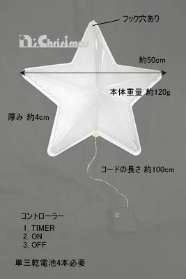 横幅:最大約50cm厚み:約4cmコードの色:クリア重量:約120g自動点滅(6時間タイマーモードあり)単三電池4本使用(別売)屋外使用可(防滴仕様)
