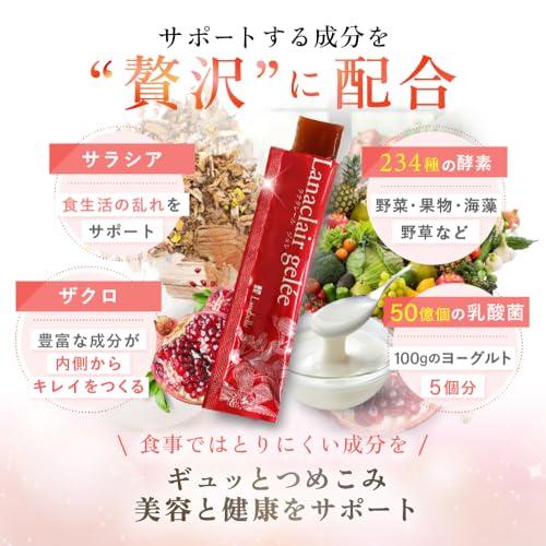 ?【ローズヒップ由来ティリロサイド配合】肝臓や筋肉の代謝を促進して、体脂肪を燃やし減らすのを助ける機能性関与成分「ローズヒップ由来ティリロサイド」を配合したダイエット(※)サポートゼリーです。(※)正しい食事・食生活のこと。 ?【難消化性デキストリン配合】日常の食事の糖分や脂肪の吸収を抑えて、お腹の調子を整えてくれる機能性関与成分「難消化性デキストリン」を1本に5gも配合! ?【W関与成分は日本初!】数多ある機能性素材の中から厳選した「ローズヒップ由来ティリロサイド」と「難消化性デキストリン」をW配合したゼリーは日本初! 燃やして整う「カロリセットゼリー」!(2024年8月消費者庁データベース調べ) ?【”食べやすさ”や“不使用”へのこだわり】無理なく手軽におしゃれに摂ってもらいたいから、お味は美容に嬉しい「ザクロ風味」個包装のゼリータイプだから持ち運びしやすくデザート感覚で毎日続けやすい! 安心の着色料・保存料・人工甘味料不使用。 ?【美しさを叶えるサポート成分を贅沢配合】サラシアや234種類以上の酵素、乳酸菌など体感性重視のサポート成分配合。1日に必要な食物繊維の不足分をこの1本で補えます。 ?【日本国内GMP認証工場で製造】ラナクレールジュレは、製造・品質管理基準の厳しい日本国内GMP認証工場で製造しています。 ■こんな方にオススメ ・体脂肪が気になる方 ・ウエスト周りの引き締めを目指す方 ・年齢と共に痩せにくくなってきた方 ・便秘気味で気になる方 ・食物繊維不足を感じる方 <原材料名> 難消化性デキストリン(アメリカ製造)、ザクロ、ローズヒップエキス末、植物発酵エキス(デキストリン、糖蜜、黒砂糖、オリゴ糖、ヨモギ、ウコン、ドクダミ、ハスの葉、高麗人参、その他(一部に卵・大豆・バナナ・やまいも・りんご・キウイフルーツ・オレンジ・ゴマ・カシューナッツを含む))、サラシアエキス末、乳酸菌(殺菌)/ ゲル化剤(増粘多糖類)、香料、クエン酸ナトリウム、甘味料(ステビア)
