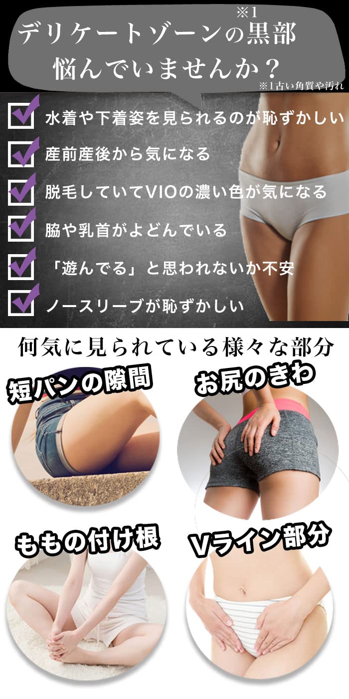 ハイドロキノンよりもパワフル且つ低刺激な「シムホワイト377」、更に2種類の「ビタミンC誘導体」、「ナイアシンアミド」「プラセンタエキス」「酒粕エキス」「レスベラトロール」を配合しデリケートゾーンに透明感を。 少量で伸びが良くベタつかず保湿力の高いテクスチャー。デリケートゾーンの他にもバストトップ、脇、肘膝、お尻など気になる部分に使用可能。 魅惑の香り「イランイラン」と女性らしいフローラルな香り「ディープブルーム」は、どちらも選び難いほど人気な香り。 7つの無添加でデリケートゾーンにも安心してご利用頂けます。 合成香料、アルコール、鉱物油、防腐剤、合成色素、紫外線吸収剤、シリコーン不使用 安心の日本製造1つ1つ丁寧に検査の元、商品をお届けします。