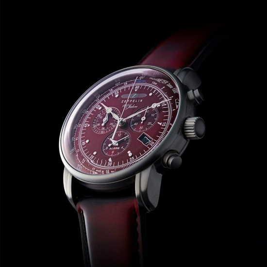 ベストセラー100周年記念シリーズクロノグラフアラームに新たに開発された、赤い文字盤は、1929年に飛行船LZ127号が世界一周の偉業に挑んだ際、飛行船の機体に映し出された美しい夕日の色を体現しています。深みのある赤色が心に問いかける、エモーショナルなタイムピースです。