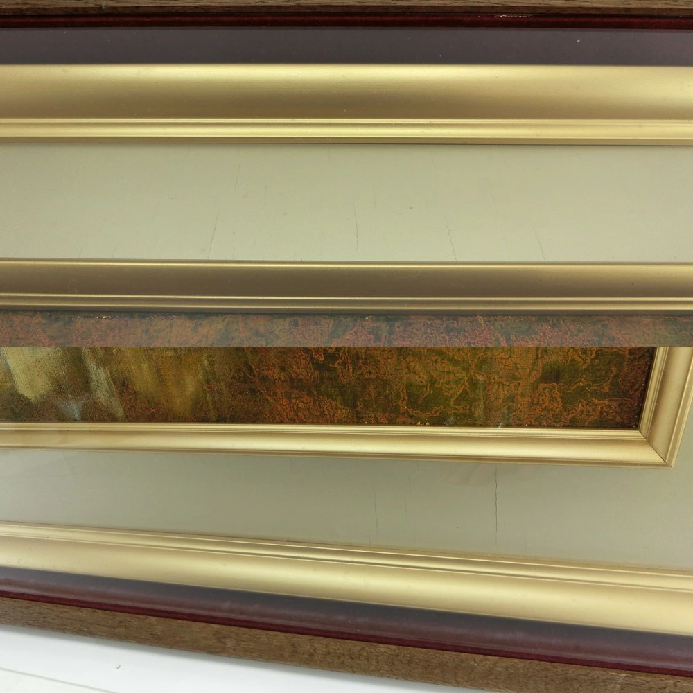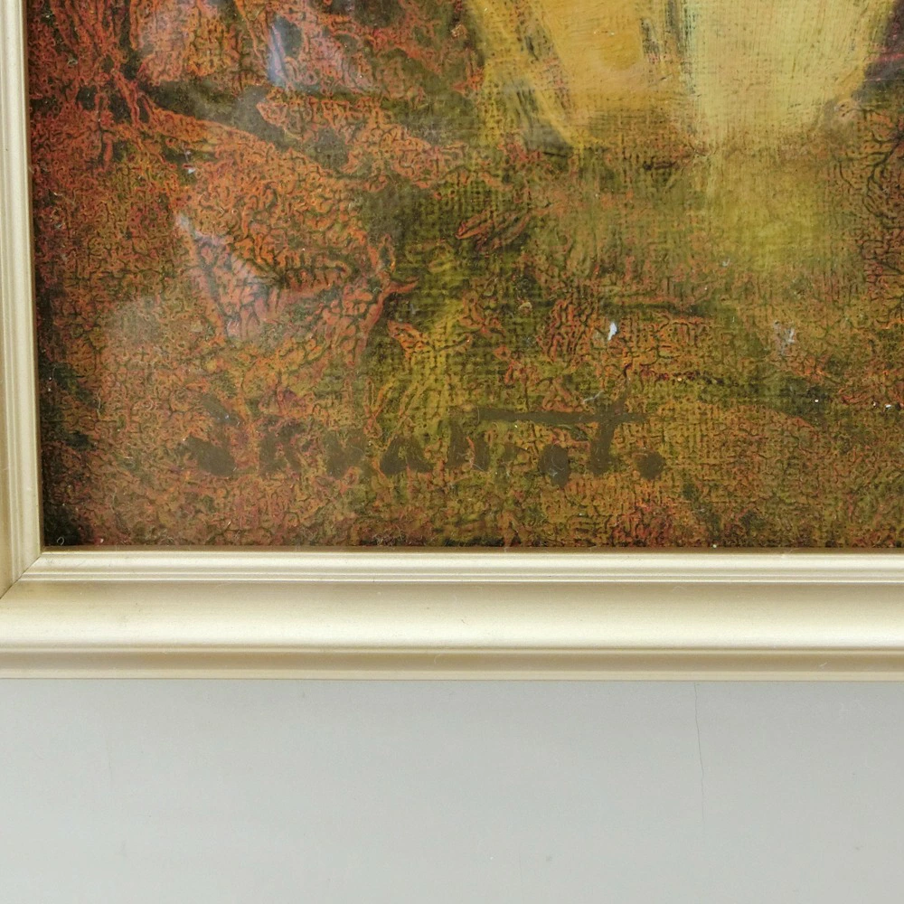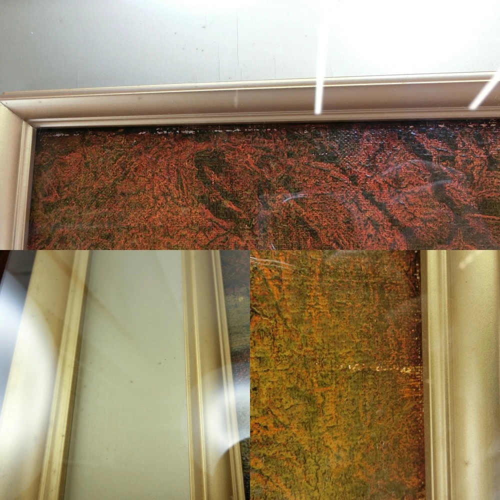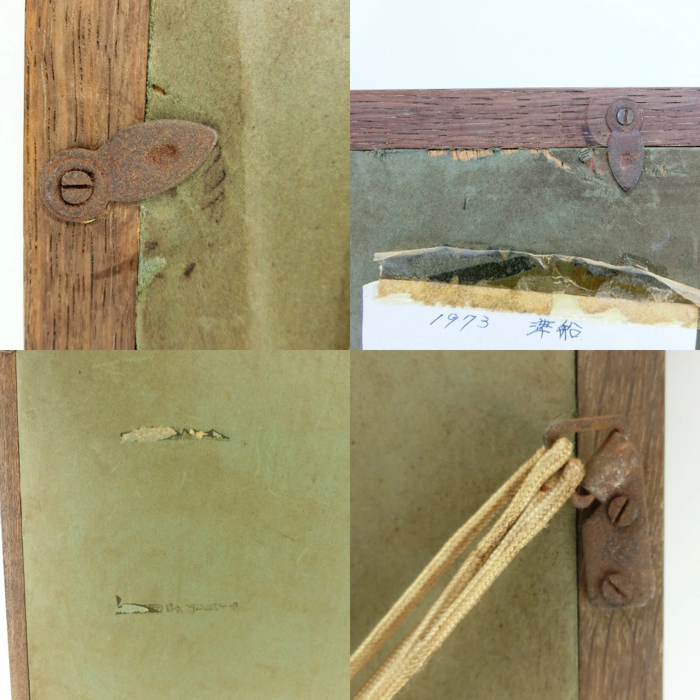作品の端の部分が額装に触れて絵の具ががれているところがございます。額装にひび割れ等がございます。