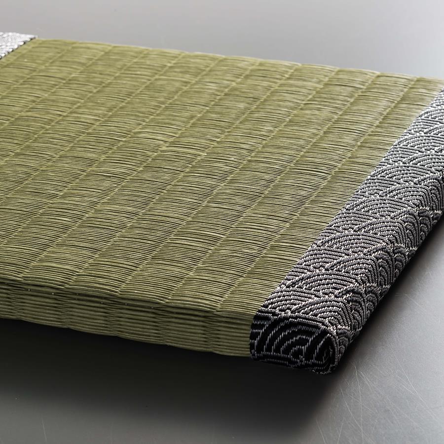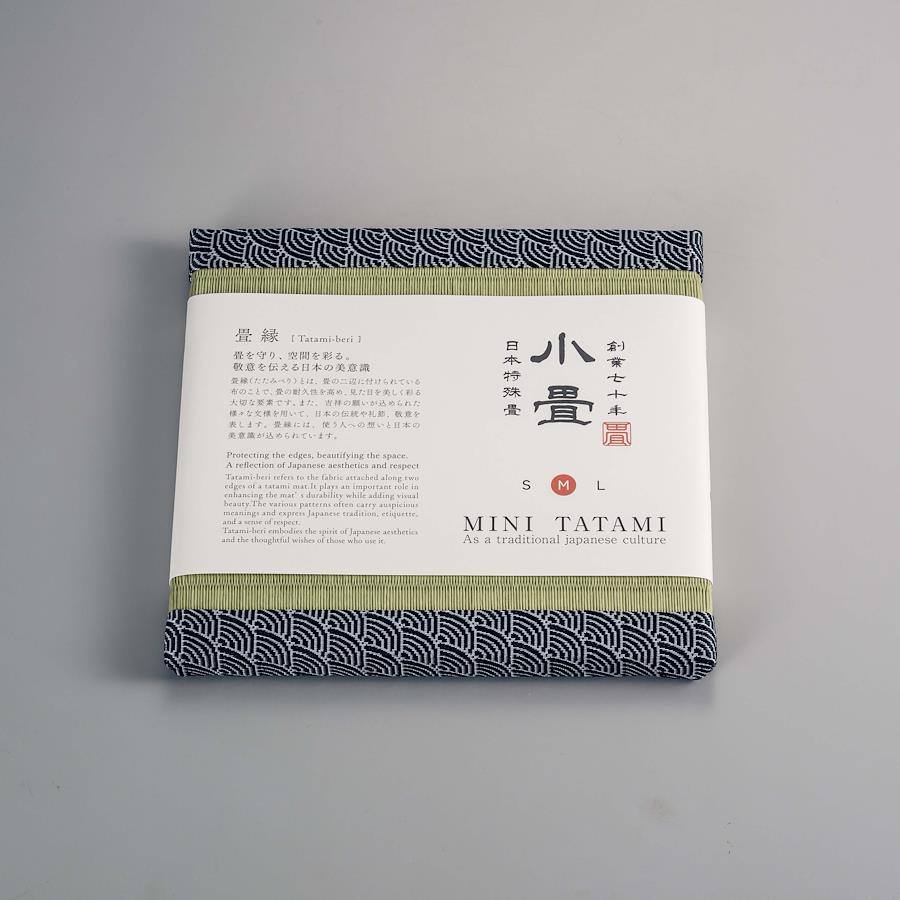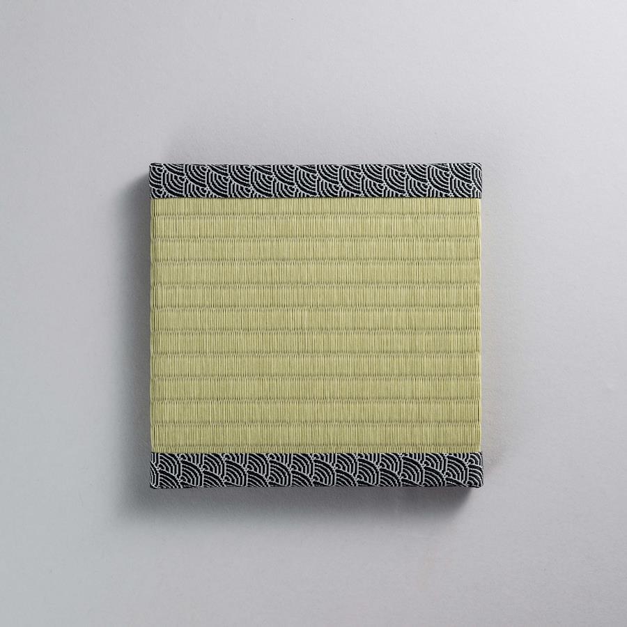 本格的な製法で作られたミニ畳です。碗を載せたり、花器やフィギュアなどの飾り台、スマホや眼鏡置きなどとして、日本の伝統文化を日常的に感じていただける商品です。畳縁を日本の伝統柄でシリーズ化しました。この商品の畳縁≪青梅波≫は、穏やかな波がどこまでも続く様子を表し、「未来永劫に続く幸せや平和な暮らし」への願いが込められています。広い海がもたらす恩恵を象徴し、幸運を招くと文様ともされています。(サイズ)約200㎜×200㎜×15㎜