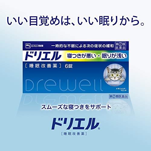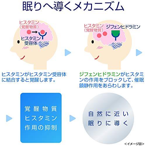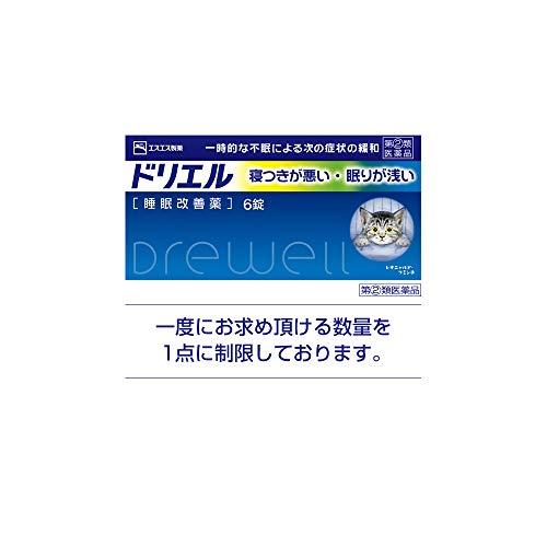 【睡眠改善薬】一時的な不眠による次の症状の緩和 寝つきが悪い・眠りが浅い●こんなとき、こんな方の一時的な不眠に○ストレスが多く、眠れない○疲れているのに、神経が高ぶって寝つけない○心配ごとがあって、夜中に目が覚める○不規則な生活で、睡眠リズムが狂い、寝つけないドリエルは就寝前の服用により、寝つきが悪い、眠りが浅いといった一時的な不眠症状の緩和に効果をあらわします。●ドリエルの効きめ成分ドリエルの効きめ成分(ジフェンヒドラミン塩酸塩)は、皮ふのかゆみをしずめたり、くしゃみや鼻水などのアレルギー症状をおさえる目的で広く使われていますが、服用により眠気をもよおすという作用があります。ドリエルはこのジフェンヒドラミン塩酸塩の持つ眠気の作用を応用してつくられた医薬品です。●ドリエルで眠くなるしくみ脳の睡眠・覚醒に関係が深い視床下部の後部には、興奮性ニューロンといわれるヒスタミンニューロンが多く存在しています。その末端から放出されるヒスタミンは、大脳皮質をはじめ脳の様々な部位の神経細胞を興奮させることによって覚醒の維持・調節をしています。ドリエルは、その効きめ成分(ジフェンヒドラミン塩酸塩)が脳におけるヒスタミンの働きをおさえ、眠くなる作用をあらわします。 内容量:12錠