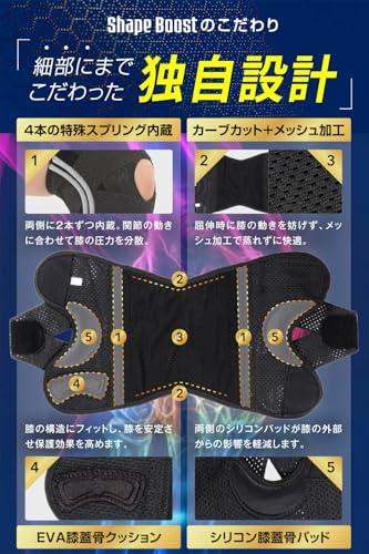 ①【欲しかったのは絶対的安心感】膝にトラブルがあると普段通りの日常生活を送ることが難しくなります。階段の昇り降り、ウォーキング、ランニング、立ち仕事やスポーツなどが今まで通りできないというのはとても辛いことです。そんな方が安心して日々を過ごせるようにしっかりと膝周りをサポートします。 ②【従来とは異なる革新的手法】本商品は二重固定方式を採用しており従来の膝サポーターよりもサポート力が向上しております。またクロスベルト方式により360°膝を包み込むように固定するのでフィット感も向上しております。 ③【シリコン膝蓋骨パッド】両側の三日月型シリコンパッドが膝の外部からの影響を軽減します。 ④【EVA膝蓋骨クッション】膝の構造にフィットし、膝を安定させて保護効果を高めます。 ⑤【独自メッシュ加工】細かいメッシュ素材で通気性に優れており、蒸れやすい夏場でも快適に使用できます。 ⑥【特殊スプリング内蔵】両側に2本ずつ内蔵されており、関節の動きに合わせて自由に曲がり膝の圧力を分散します。 ⑦【カーブカット構造】歩行時、屈伸時に筋肉や膝の動きを妨げないようにカーブカット構造を採用しています。