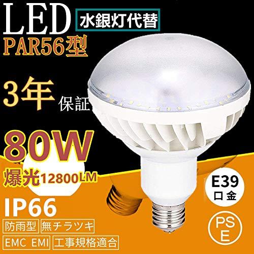 2.【仕様 ・LEDビーム電球】■口金:E39、PAR56形LED、消費電力:80W、ランプ光束:12500ルーメン(弊社実測値)、防水防塵試験(IP66)、ビーム角210度、白過ぎずに自然な明るさの昼光色(6000K・弊社実測値)■演色性能はRa.85(弊社実測値)で看板の色を損なうことなく照らします。■電源回路(PF90%)内蔵なので外部電源の設置は不要、AC100V?240V対応、PSE適合、保証期間2年、定格寿命50000H、直径φ165mm x 長さ230mm、重量約1300g、動作保証温度-20?50℃ ■岩崎、Panasonic、東芝などの アイランプホルダに対応確認済み。■ PSE準拠 電源安全法 検査済み