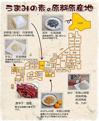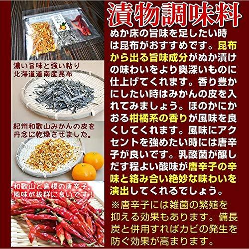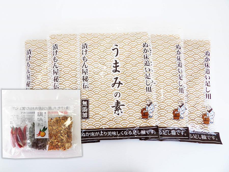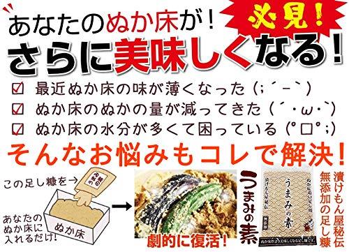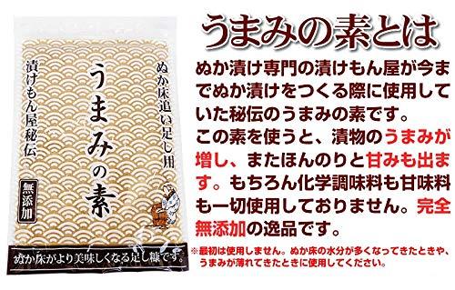 2kgに対して、うまみの素を4分の1程度ぬか床に入れて良くかき混ぜて下さい。漬物のうまみが増し、またほんのりと甘みも出ます。もちろん化学調味料も甘味料も一切使用しておりません。