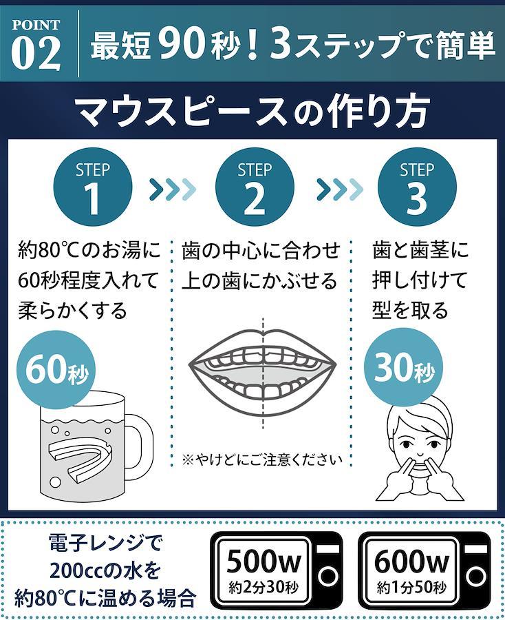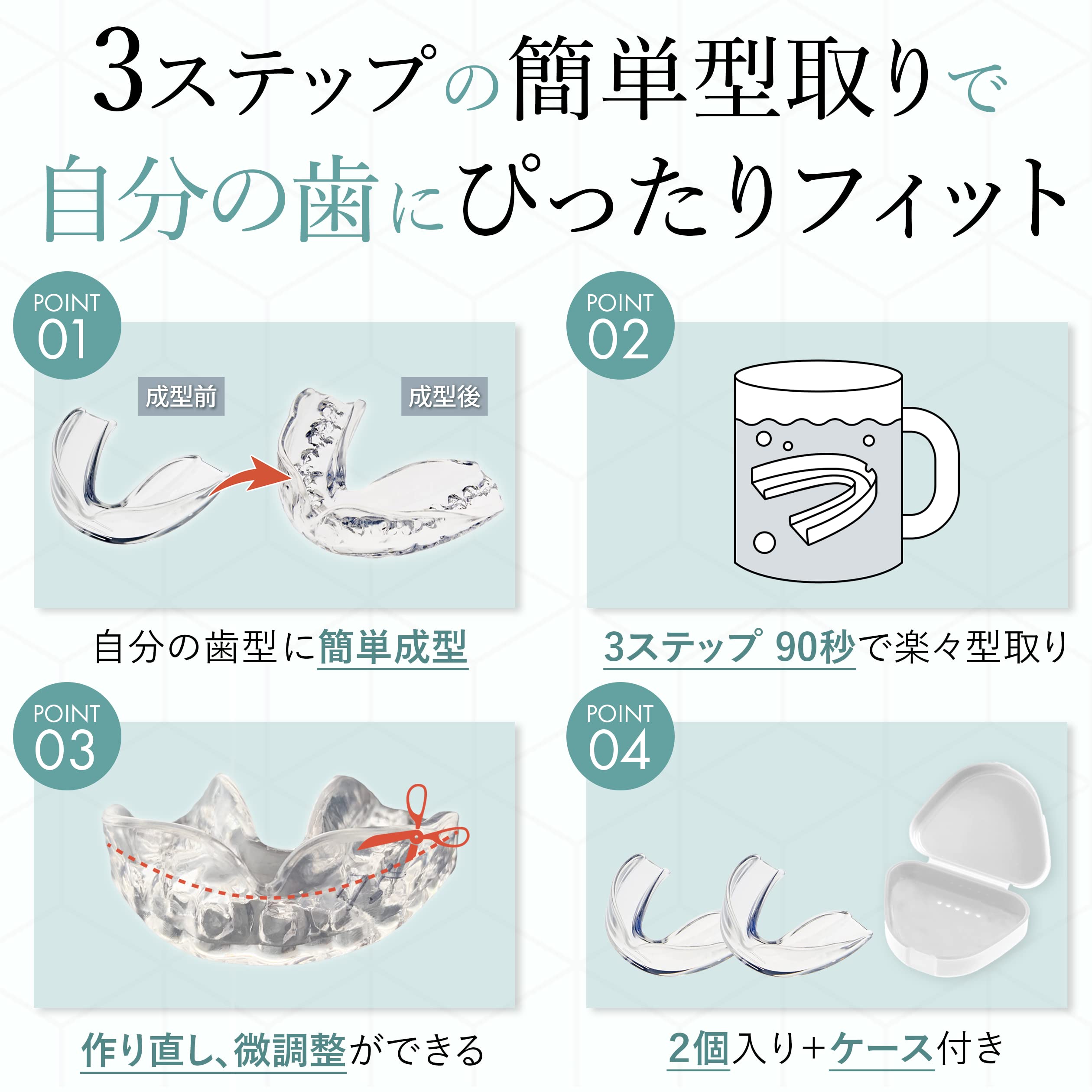 【歯科医師監修】現役歯科医師監修のマウスピース 【フィット感抜群マウスピース】DENTESの自分専用のマウスピース。睡眠中のあなたの大切な歯・健康を守ります。型取りタイプ、2個入り、専用ケース付き。 【簡単型取り】自分の歯形で成型するからフィット感抜群。作り方は、お湯に入れて柔らかくして歯型に合わせて型を取るだけ。作り直し、微調整が可能なので就寝中も外れません。 【2個入り+ケース付き】専用ケースは通気性抜群。2個入りなので、万が一型取りに失敗しても安心。 【セット内容】型取りマウスピース×2・専用ケース×1・日本語説明書、【サイズ】フリー、【素材】本体材質:EVA樹脂・ケース材質:PP樹脂 【使用上の注意】使用前・使用後はマウスピースを水で洗浄した上で、口内が清潔な状態で使用してください。使用後は、日陰で乾かし専用ケースにいれて保管してください 。