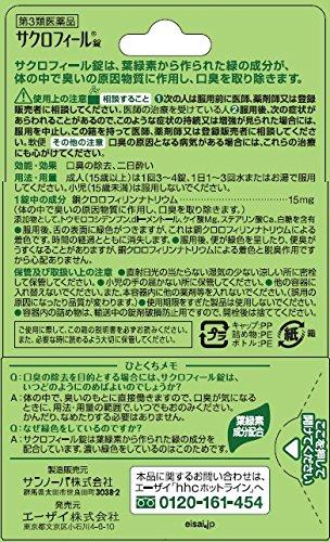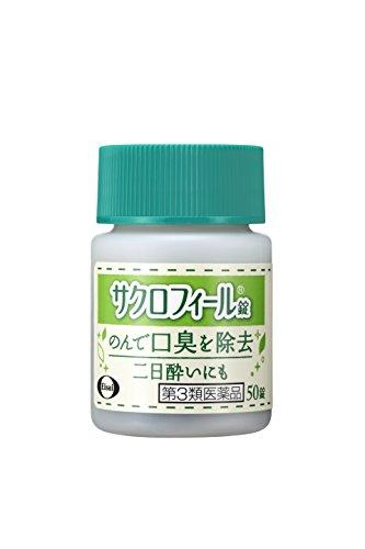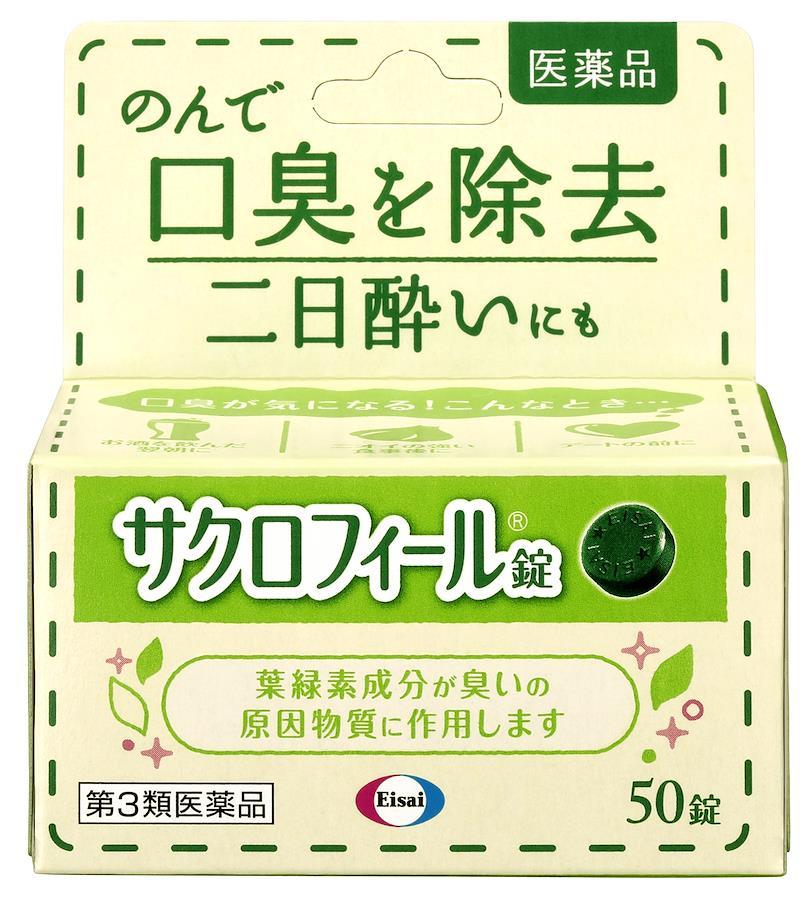 医薬品のんで口臭を除去二日酔いにも葉緑素成分が臭いの原因物質に作用しますサクロフィール錠は、葉緑素から作られた緑の成分が、体の中で臭いの原因物質に作用し、口臭を取り除きます。医薬品は、用法用量を逸脱すると重大な健康被害につながります。必ず使用する際に商品の説明書をよく読み、用法用量を守ってご使用ください。用法用量を守って正しく使用しても、副作用が出ることがあります。異常を感じたら直ちに使用を中止し、医師又は薬剤師に相談してください。 内容量:50錠