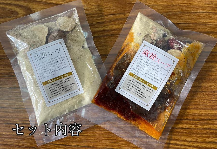 【食品のため返品不可になります】液体スープを凝縮して粉末スープへ改善しました! 火鍋の辛い麻辣スープと辛くない白湯スープのセットです。 旨辛の麻辣スープには野菜をジューシーに、お肉の旨味を引き立てます。 また薬膳スープは寒い季節に体を温めます。 コラーゲンたっぷりの白湯スープの特徴はコクと香り。 美容に効果的な漢方と鶏の香りが食欲を誘います。 旨いだけでなく、ふんだん使われた漢方の香りもお楽しみいただけます。 薬膳火鍋yangyangの火鍋はどんな野菜やお肉にもよく合うため、ご家庭の冷蔵庫にある食材で本格薬膳火鍋をご自宅で召し上がっていただけます。 ①1リットルの水をお鍋に入れる②沸騰するまで加熱する ③弱火にしてマーラースープの素または白湯スープの素を鍋に入れ強火にして一煮立ちさせる④ニンニク、生姜などともに好きな野菜や肉とともに本格薬膳火鍋を食べる