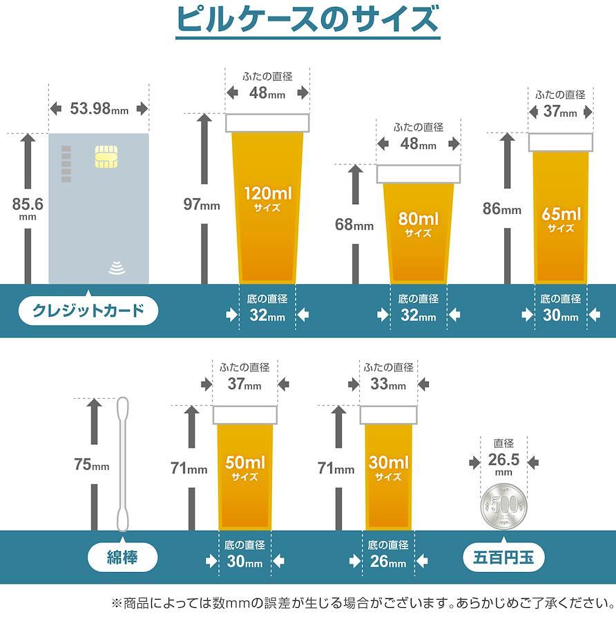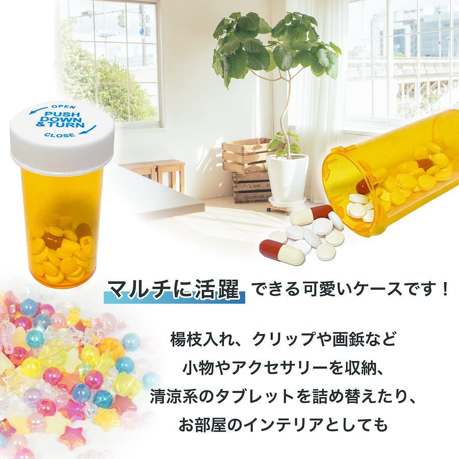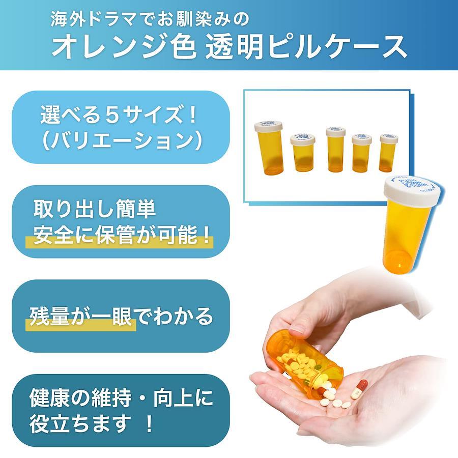 【気持ちも上がる映えなアイテム】アメリカハリウッド映画や海外ドラマで頻繁に登場するオレンジ色のピルケースセットです。バスルームの鏡扉の裏に置いたり、机の引き出しの中やオフィスのロッカーに忍ばせるだけで、あのシーンを手軽に再現します。 【目的に合わせた様々なサイズをご用意】フィッシュオイルやマルチビタミンなど大きめのカプセル・錠剤を入れるのにおすすめの大容量の120MLサイズから、携帯に便利な小さめサイズ(30ML, 50mL)まで。小さめサイズは、ポケットやバッグの中にすっぽり収まるサイズで通勤、通学はもちろん旅行やアウトドアにもおすすめの薬ケースです。 【シンプルかつ多機能】ピルケースのオレンジ色は長期保存用の遮光性のために。透明なので中身がどれほど詰まっているかも一眼で判断できます。また、子供やペットの誤飲防止用にフタを押しながら回さないと開かないようになっており、スタイリッシュな見た目だけでなく、機能性も兼ね備えています。 【多岐にわたる用途】薬入れやサプリメントのケースとしてだけでなく、小物やアクセサリーを収納したり、フリスクやミンティア、ラムネなどの清涼系のタブレットを詰め替えたり、お部屋のインテリアとして飾ったりとマルチに活躍できるかわいいケースです。 【各サイズ】30mL(直径2.5cm, 高さ7.1cm)、50mL(直径3.1cm, 高さ7.1cm)、65mL(直径3.8cm, 高さ7.1cm)、80mL(直径3.1cm, 高さ8.6cm)、120mL(直径3.8cm, 高さ9.8cm)