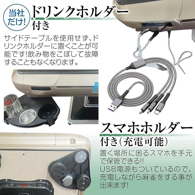 この商品について ●狭い部屋でも設置が可能な全自動麻雀台!遊ばない時はコンパクトになり空きスペースに収納できます。しかもキャスター付きなので移動もらくらく♪また、他社様には無い、牌トレーも一緒につけておりますので、折り畳んだ際に邪魔になる牌を片付ける事も可能です! ●マンションやアパートのお客様にも安心してお使い頂ける様、『静音』を意識して開発を致しました。他社様と比べても音は小さめです。もし、それでも気になると言う方には、床に吸音マット等を引く事を推奨いたします。 ●真ん中の形が四角になっていますので、きれいな横列にする事ができ、サイコロもボタンを押すだけで回せる快適仕様となっております。また、点棒収納口は広く作っておりますので、点棒が取り出しやすくなっております。 ●こちらの台は、極力、台座に物が置かなくてもいいように、ドリンクホルダー(灰皿付き)やスマホ置きまで完備しております。USB充電ケーブルもセットにしておりますので、充電しながら麻雀を楽しむことが可能です。また、リーチ棒を設置する穴が有りますので、誤って牌と一緒にリーチ棒を入れて故障の原因となるという心配も有りません。もっと見る