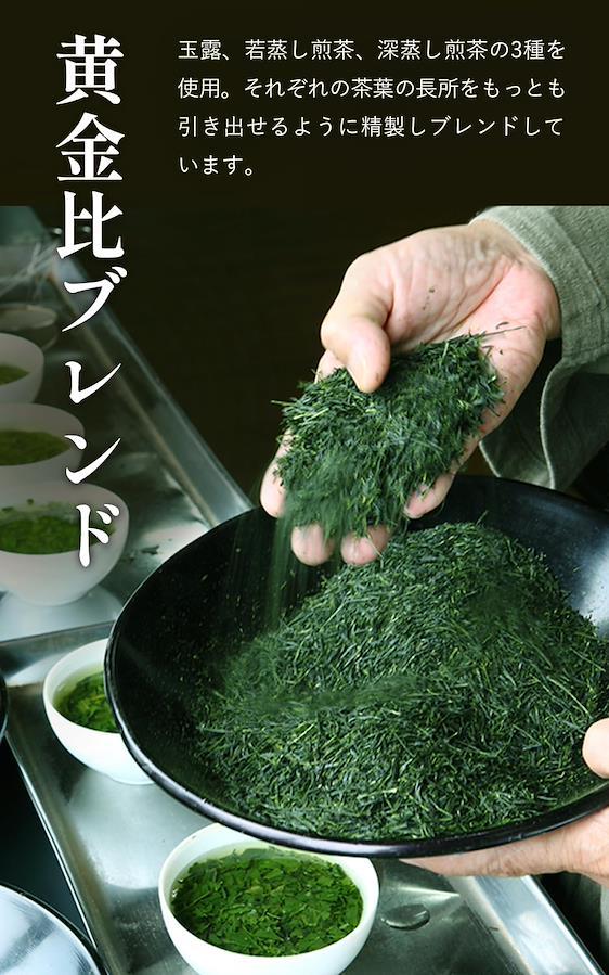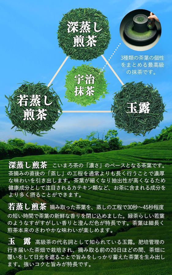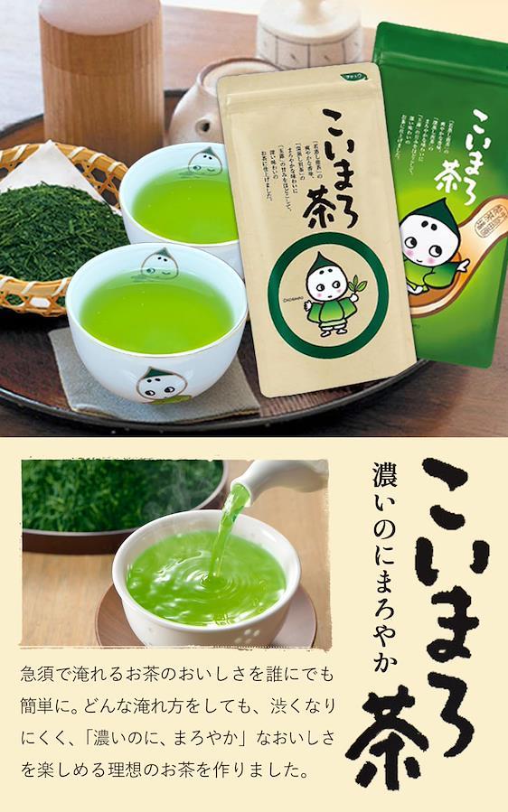 淹れた時の色はきれいな濃い緑色でありながら、味は渋くなくまろやか。これが「こく・まろやか」な日本茶、「こいまろ茶」の特徴です。より美味しく、しかも簡単に日本茶を飲めるように、との思いから、まずお客様に理想の日本茶についてアンケートを実施いたしました。その結果「日本茶の色は濃い緑色」が75%、「日本茶の味は濃くまろやか」が71%という結果が! お客様の求めておられる理想の日本茶は「こく・まろやか」。こうして「こいまろ茶」の開発は始まりました。しかしながら、日本茶の色を濃くすると味は渋くなり、まろやかな味にすると色は薄くなり、試行錯誤を重ねること3年。ようやくお客様の理想の【色は濃く・味がまろやか】な日本茶にたどり着きました。使う茶葉は一番茶葉を100%使用。香り高い若蒸し煎茶、濃厚な味と色の深蒸し煎茶、旨味と奥深いコクが魅力の玉露。個性豊かな3つの味わいを上手に調和させ、それぞれの良さを引き出せるよう高級宇治抹茶を絶妙にブレンド。そうする事で、素材の良さを引き出し上品な口当たりと鮮やかな緑色を実現。まさに「濃いのに渋くなくまろやか」な理想の味です。【免責事項】メーカーによる商品リニューアルに伴いパッケージ(内容量も含む)変更が行われた場合、新パッケージでお届け致します事ご了承願います。