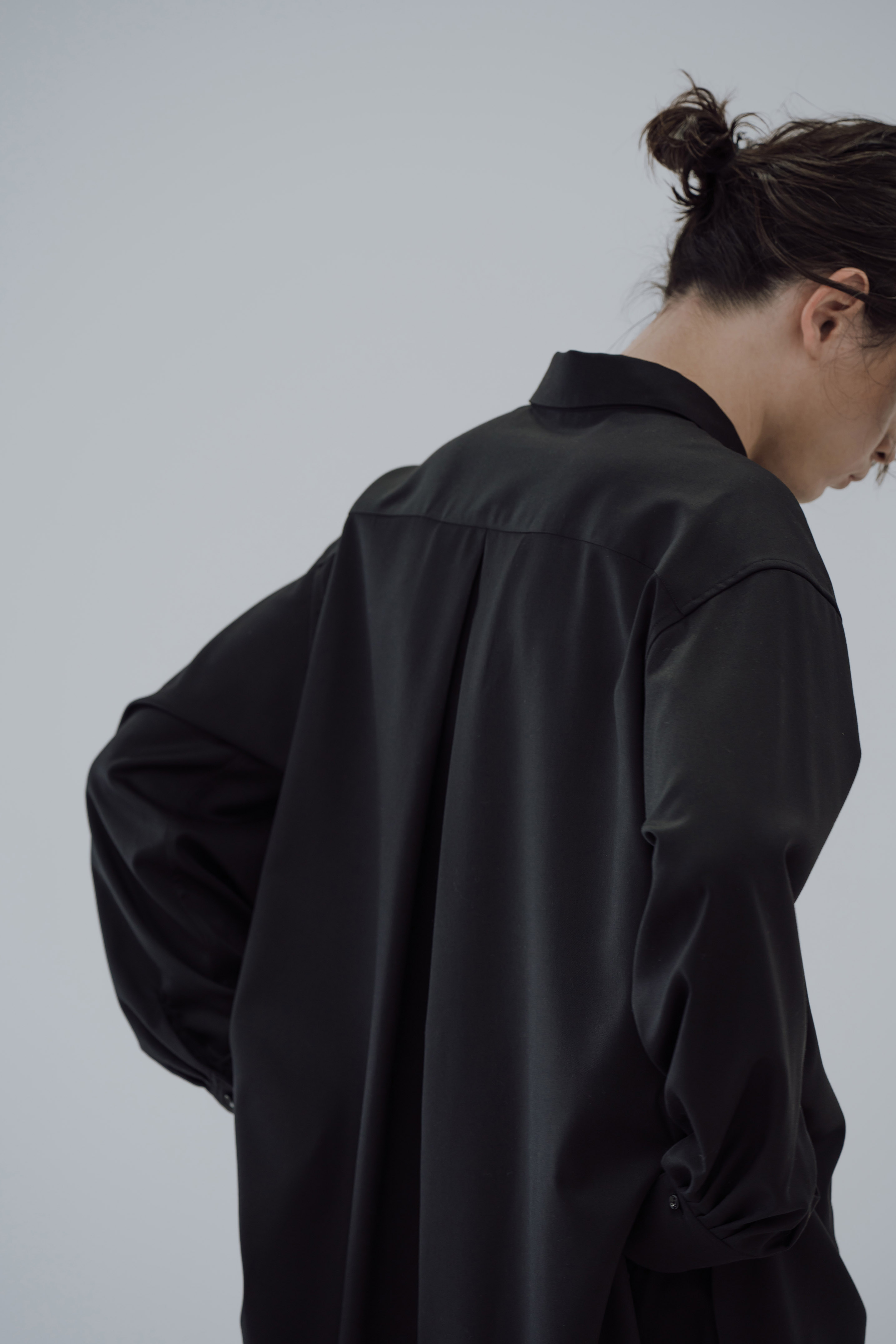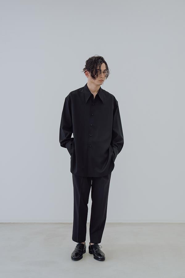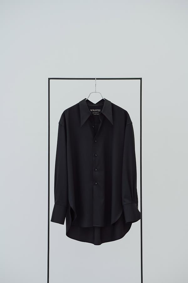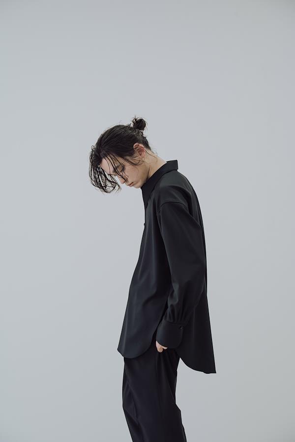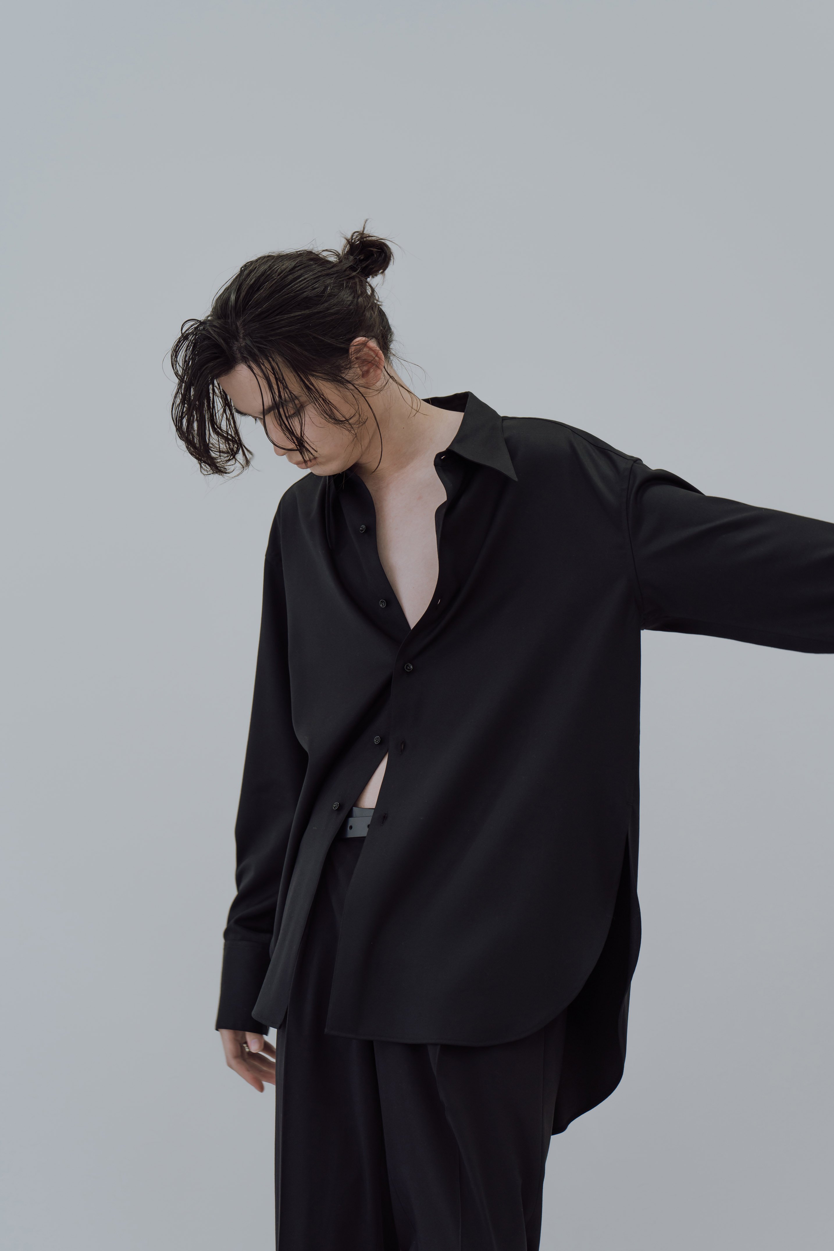 【シャツについて】ロングポイントカラーが印象的なドレスシャツ。インタックの深く入ったバックスタイルやゆとりのある身頃、深いスリットは美しいドレープを創り出し、サテンの艶を一層際立たせる。袖口や裾に施された曲線は肌を柔らかく縁取り、尖った襟や黒の強さを優しく包み込む。リラックスと緊張を同時に孕む、夜に溶け込んでいくようなしっとりとした湿度を感じる1着です。