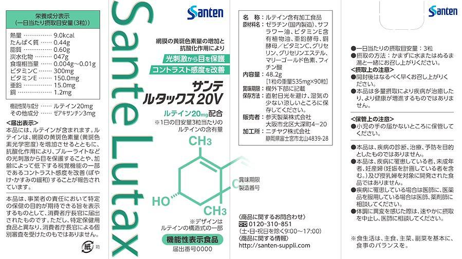 90粒x12個(1年分)のお買い得品です。 サンテルタックス20+ビタミン&ミネラルは 2019年11月末より サンテルタックス20Vに商品名が変更されました。 機能性表示食品に登録され、よりご安心してお買い求めいただけます。 医薬品メーカーとして長年培った品質管理のノウハウを活かし、健康補助食品 GMP※の認証を受けた工場で製造・管理しています。