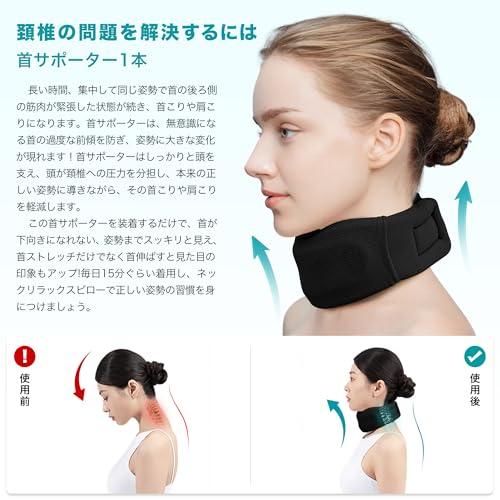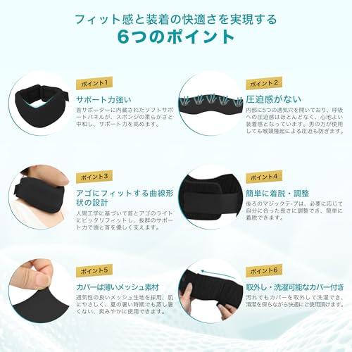 【ネックブレースのデザイン】:パソコンやスマートフォンの前にいる時間が長くなっている今日、私たちは前かがみの姿勢が続き、首が伸びた状態(ストレートネック)になります。私たちの頚椎を保護するため、首にある頚椎上部の隙間(クッション)がなくなり、首の整形外科医者のアドバイスと確立により、人の顎と首の曲線弧度によってフィットすることができ、頸椎の自然なカーブに合わせて首サポーター作成しました。 【詳細設計】:1.首サポーターに内蔵されたソフトサポートパネルが、スポンジの柔らかさと中和し、サポート力を高めます。2.内側に5つの通気穴を開いており、喉頭隆起による圧迫感はありません。3.アゴにフィットする曲線形状の設計、人間工学に基づいて首とアゴのライトにビッタリフィットし、抜群のサポート力で頭と首を優しく支えます。 【詳細設計】:4.後ろのマジックテ-プは、必要に応じて自分に合った長さに調整でき、簡単に着脱できます。5.通気性の良いメッシュ生地を採用、肌にやさしく、夏の暑い時期でも蒸し暑くない、爽みやかに使用できます。6.取外し・洗濯可能なカバー付き、汚れてもカバーを取外して洗濯でき、清潔を保ちながら快適にご使用頂けます。 【生活大活躍】疲れを感じた時に、お昼寝などの睡眠時に、長時間の仕事時にこの首サポーターを使ってください。使用シーン:デスクワーク、勉強時、長時間の新幹線や飛行機、睡眠時などにご使用いただけます。頸部の倦怠感やこわばり、痛みを和らげます。 【品質保証】 フィット感が重要となる首サポーターはお客さまの首に合うかどうかを確認いただくために、サイズ直しは商品到着後30日まで無料です。首サポーターが到着後から12ヶ月の間の不具合が生じた場合、カスタマーサポートへお問い合わせいただければ、弊社にて不具合を確認した後、同一製品との交換を承ります。