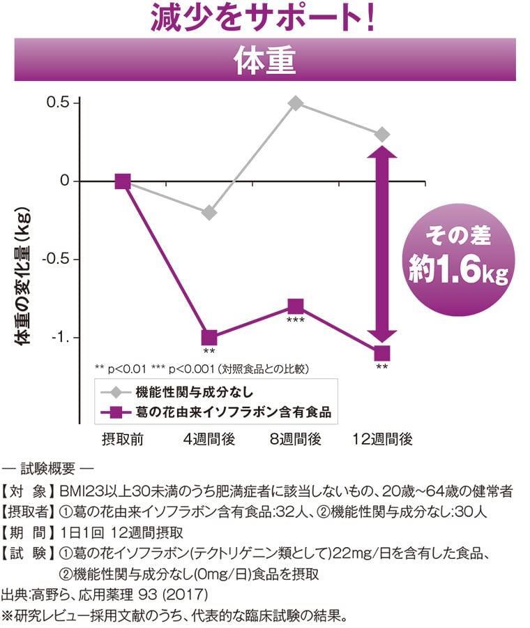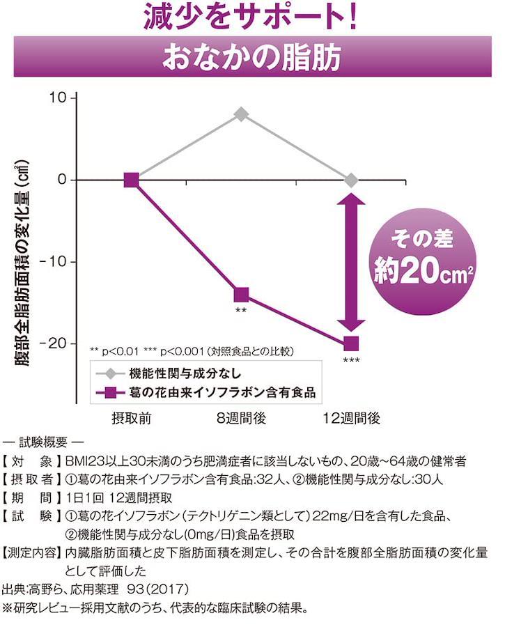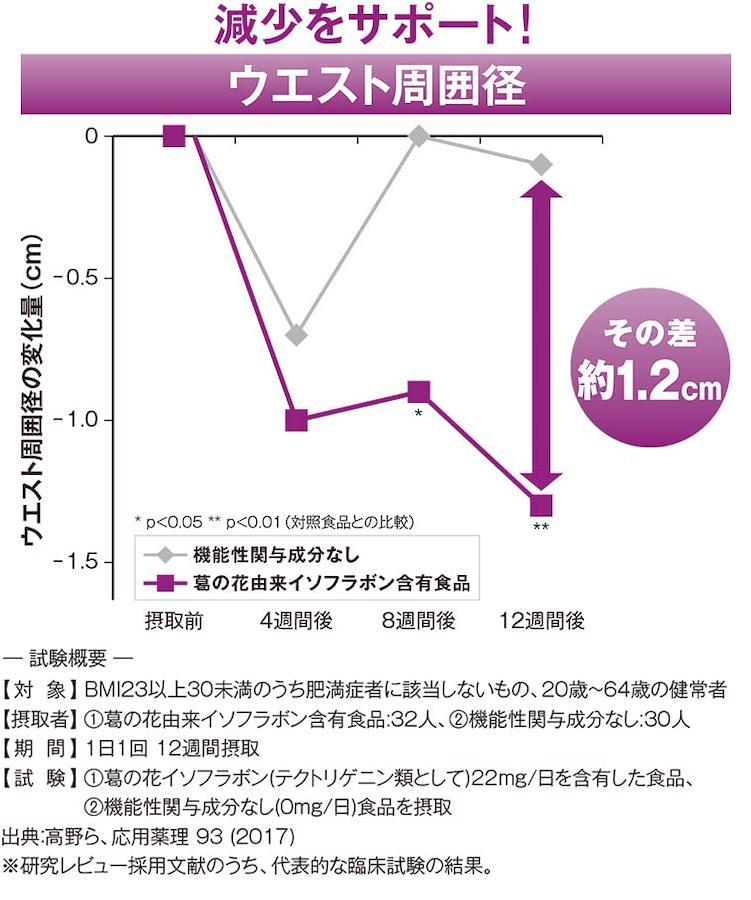 【Point1】葛の花由来イソフラボンが日常生活活動や運動時(*1)のエネルギー消費を高める。日常生活でのちょっとした運動でエネルギー消費をアップします。※1 3.5メッツ程度のもの 【Point2】3つのメカニズムで脂肪にアプローチ。葛の花由来イソフラボンが3つのメカニズムによりBMIが高めの方の体重やおなかの脂肪を減らすのを助けると考えられています。 【Point3】葛の花由来イソフラボンが体重やおなかの脂肪を減らすのを助ける。葛の花由来イソフラボンがBMIが高めの方の、体重やおなかの脂肪(内臓脂肪と皮下脂肪)やウエスト周囲径を減らすのを助ける機能があります。 【内容量】120粒(約30日分) 【公式セット】メタバリアEX1日分パウチ(8粒)×2包付 【機能性表示食品】■消費者庁届出番号:G548 ■届出商品名: メタバリア葛の花イソフラボンEXa 【こんな方にオススメ】肥満気味な方、またはおなかの脂肪やウエスト周囲径が気になる方で、特に日常の家事や仕事で忙しく、習慣的な運動に取り組めていない方やすでにヨガやウォーキングなど軽い運動に取り組んでいて、その効果を高めたい方 など