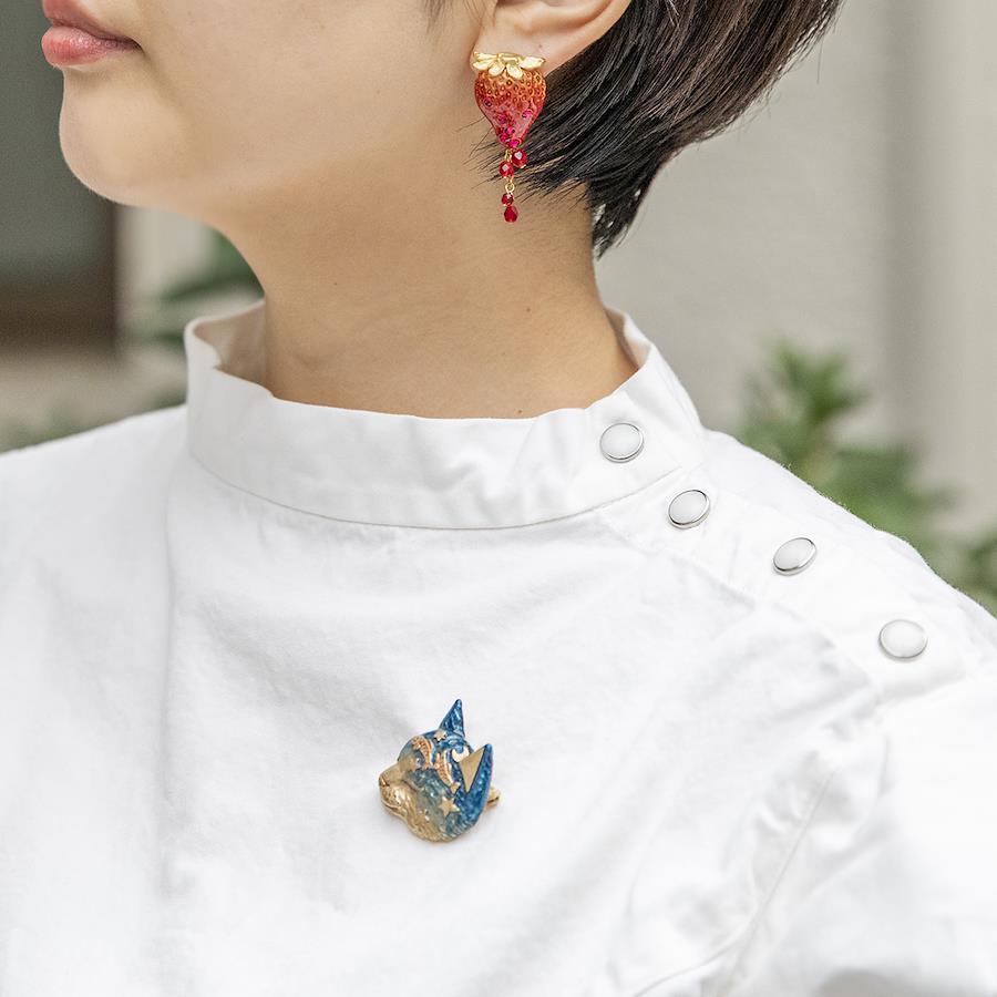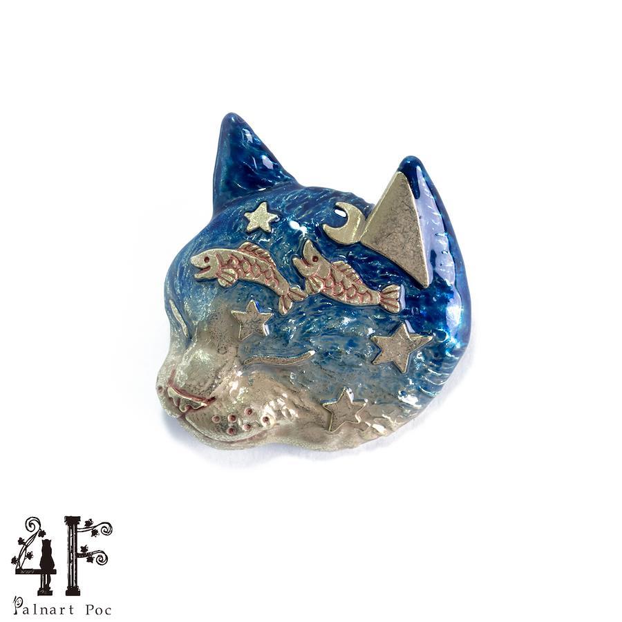 深い眠りについているネコが夢を見ている様子のブローチ。煌めく星空の下で魚たちが楽しそうに泳いでいます。ブローチの裏面にも元気よく飛び出してしまった魚が一匹。ネコは夢の中で泳いでいる魚たちを「おいしそう…」と狙っているのでしょうか?