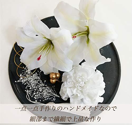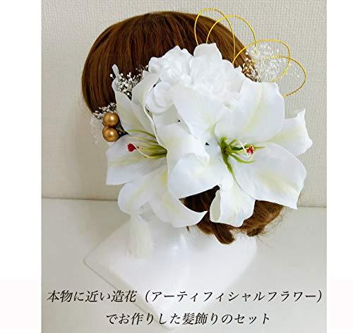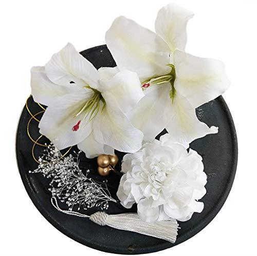 本物に近い造花(アーティフィシャルフラワー)でお作りしたカサブランカ 百合(ゆり)をモチーフにした髪飾りのセットです。一点一点手作りのハンドメイドなので、細部まで繊細で上品な作り。お花に存在感がありとっても華やかにお召しいただけます。Uピンで留められるので角度も変えやすくアップスタイル、ダウンスタイルなど様々なヘアアレンジに対応できます。トップ、サイド、シニヨンなど付ける位置を変えることでイメージを変えることができます。挙式と披露宴で イメージを変えたい方にもぴったりです。結婚式、披露宴、ブライダルはもちろん、成人式、和装前撮り、卒業式、七五三、お正月、ひな祭り、など様々なイベントでお使いいただけます。内容:カサブランカ15cm 2点、白ダリア1点、プリザーブドフラワーカスミ草3点、金ボール3点付1点、金水引1点、白タッセル1点 ※商標5952326号取得済み