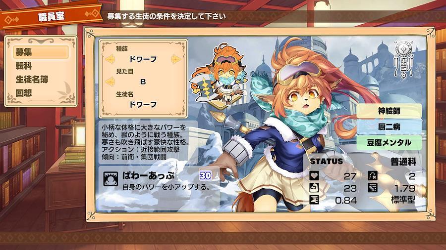 厨二病 + 神絵師 + 豆腐メンタルのドワーフ!?種族×見た目に加え、ランダムで付与される3つの「属性」で個性豊かなキャラメイク!自分だけの生徒で、自分だけのパ ーティを組み?てよう!