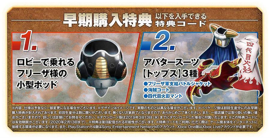 【早期購入特典】以下が手に入る特典コード-1ロビーで乗れるフリーザ様の小型ポッド-2アバタースーツ【トップス】3種-フリーザ軍支給バトルジャケット-海賊コート-四代目火影マント*内容・仕様は予告なく一部変更になる場合がございます。*デザインはイメージです。実際のものとは異なる場合がございます。*パッケージ版は初回生産分にのみ早期購入特典が封入されております。初回生産分は数に限りがございます。無くなり次第終了となりますので、あらかじめご了承ください。*ダウンロード版は2019年3日13日 (水) までにダウンロードした場合に付属いたします。*この特典コードには有効期限がございます (2020年2月13日まで) 。*特典は後日配信される可能性がございます。*特典コードをご利用いただく際は、ゲーム機本体をインターネットに接続する環境が必要になります。また、??4版はSony Entertainment Networkのアカウント、Xbox One版はXb